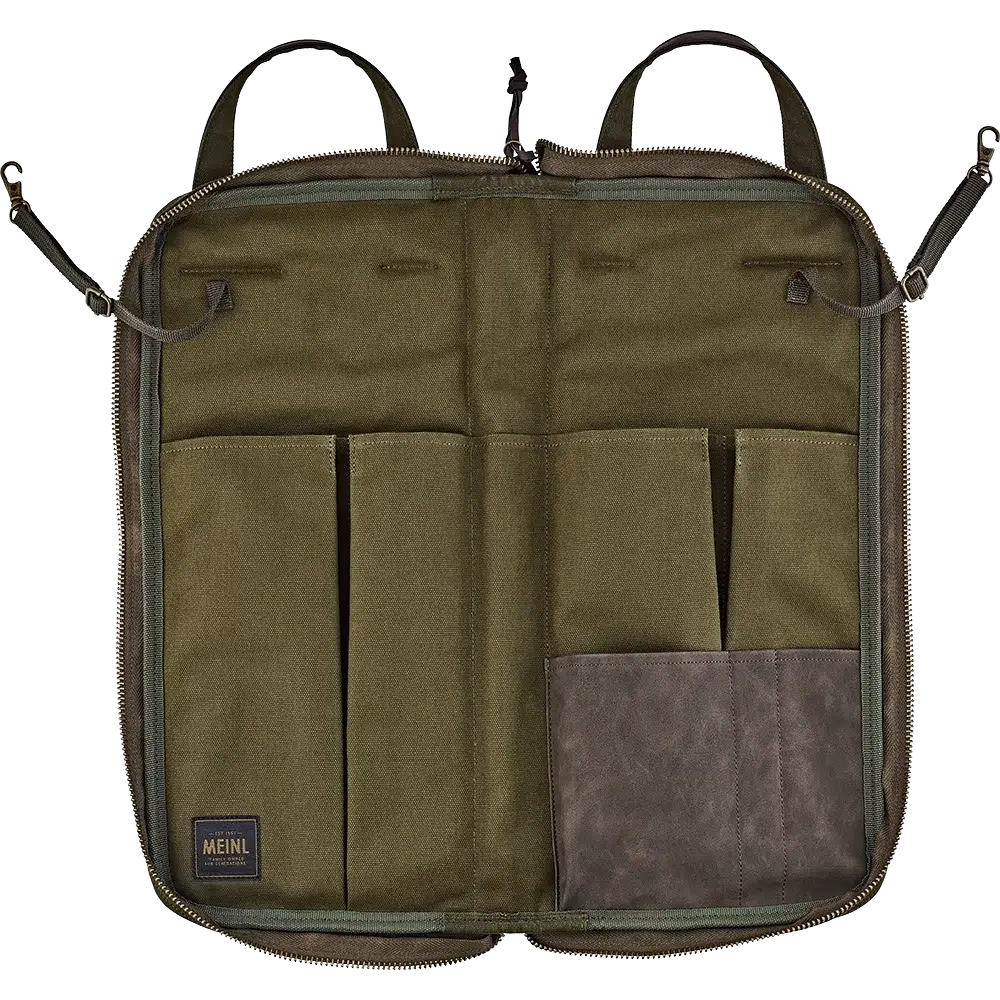 Elevate your drumming experience with the Meinl Waxed Canvas Stick Bag in Forest Green. Made with durable 24-ounce cotton canvas and a water resistant wax coating, this bag is built to last while aging beautifully. With multiple pockets for organizing all your drumsticks and accessories, it also features floor tom hooks and straps for easy access during performances.