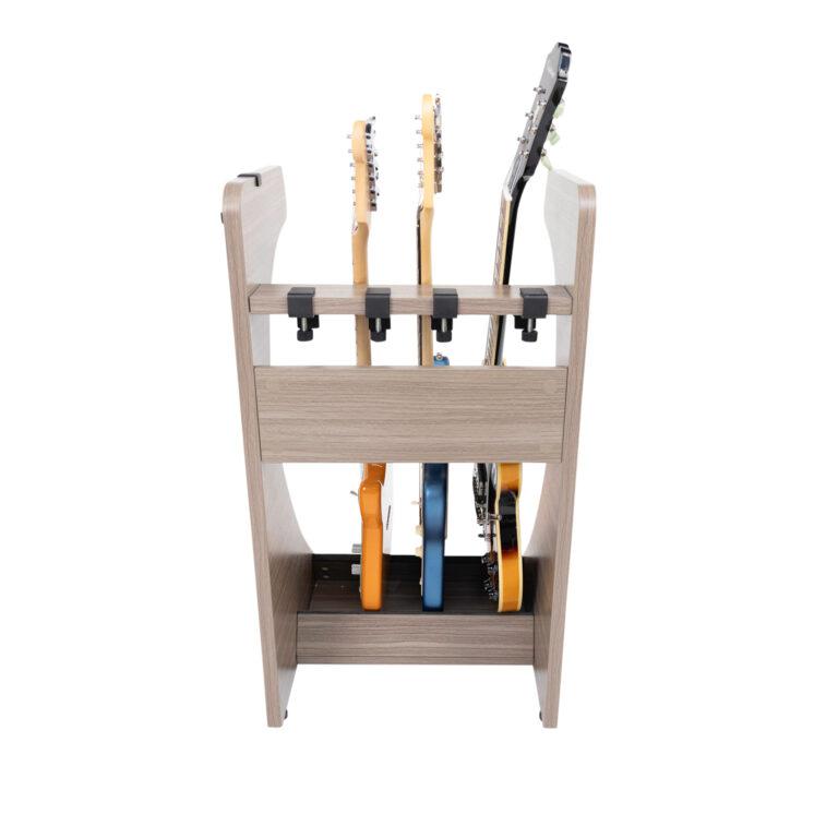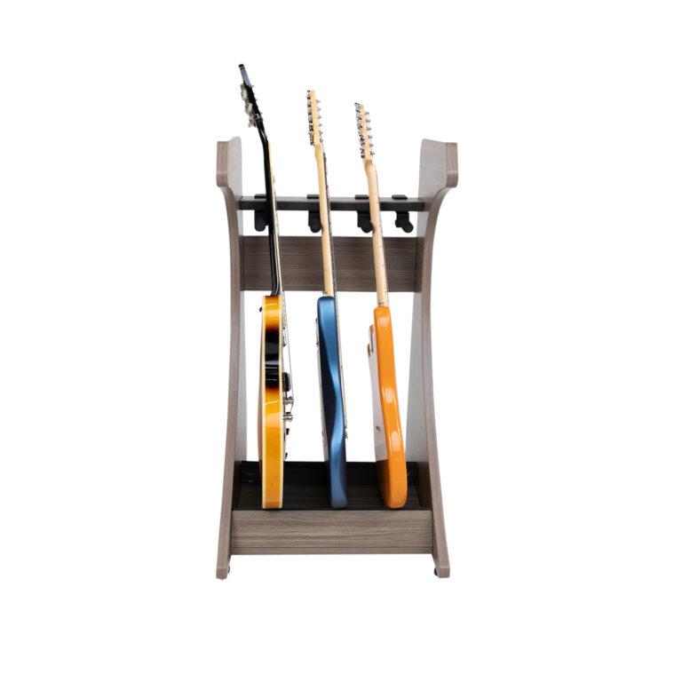 The Elite Three Electric/Acoustic Guitar Rack offers a solid solution for storing and protecting up to four guitars. It features an attractive Driftwood Grey finish and is designed with durable framework to ensure your instruments maintain their playability for years to come. The rack features adjustable mounting angles and tiered-height construction for easy access to instruments.