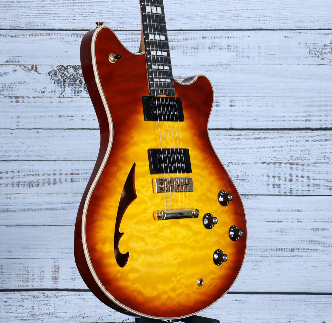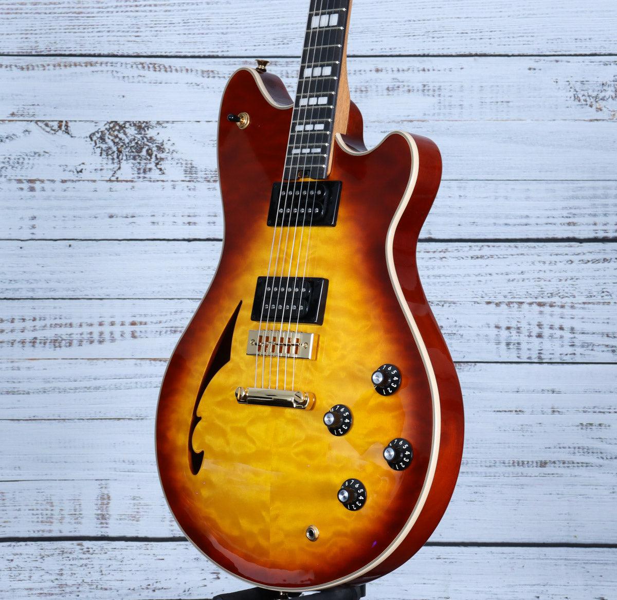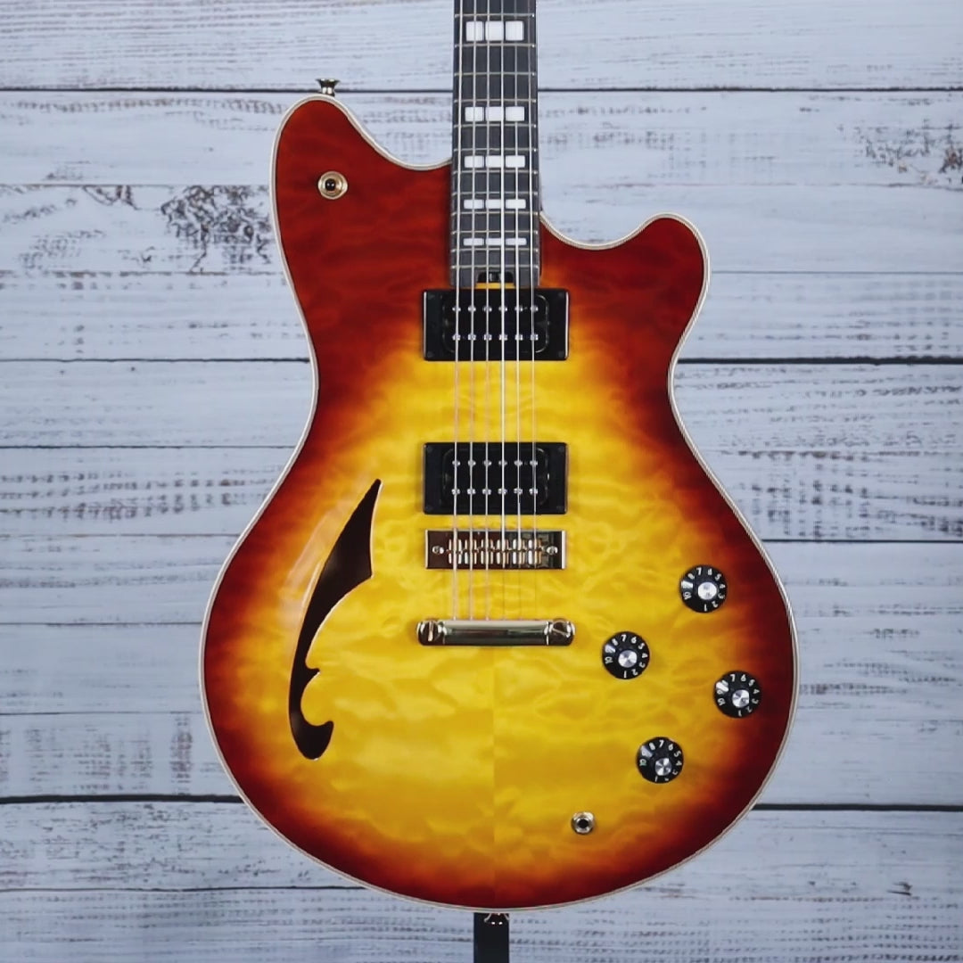 The SA-126 guitar represents a unique blend of semi-hollow and solid body designs, featuring a chambered/center block solid body and a bolt-on neck. Developed by industry expert and musician, Wolfgang Van Halen, this instrument boasts a slim neck, jumbo frets, and high output pickups for exceptional performance. Ideal for both powerful rhythm tones and speedy lead solos, the SA-126 exemplifies innovation and versatility in its design.