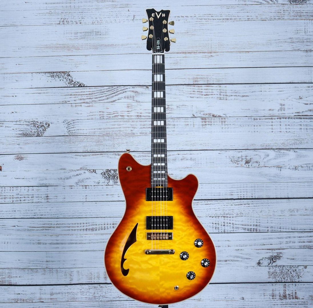 The EVH SA-126 Special QM Electric Guitar boasts a chambered Mahogany body and basswood Centerblock for enhanced stability and tonal quality. Its Maple top, available in solid or quilted finishes, is elegantly complemented by a 5-ply body binding. The 22-fret Ebony fingerboard with jumbo frets and triple block inlays rests on a reinforced Mahogany neck with a 24 and three quarter inch scale length. This modern-classic instrument offers a comfortable and familiar feel. Plus, the spoke wheel truss rod adjustment at the neck's end allows for easy, on-the-go adjustments.