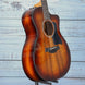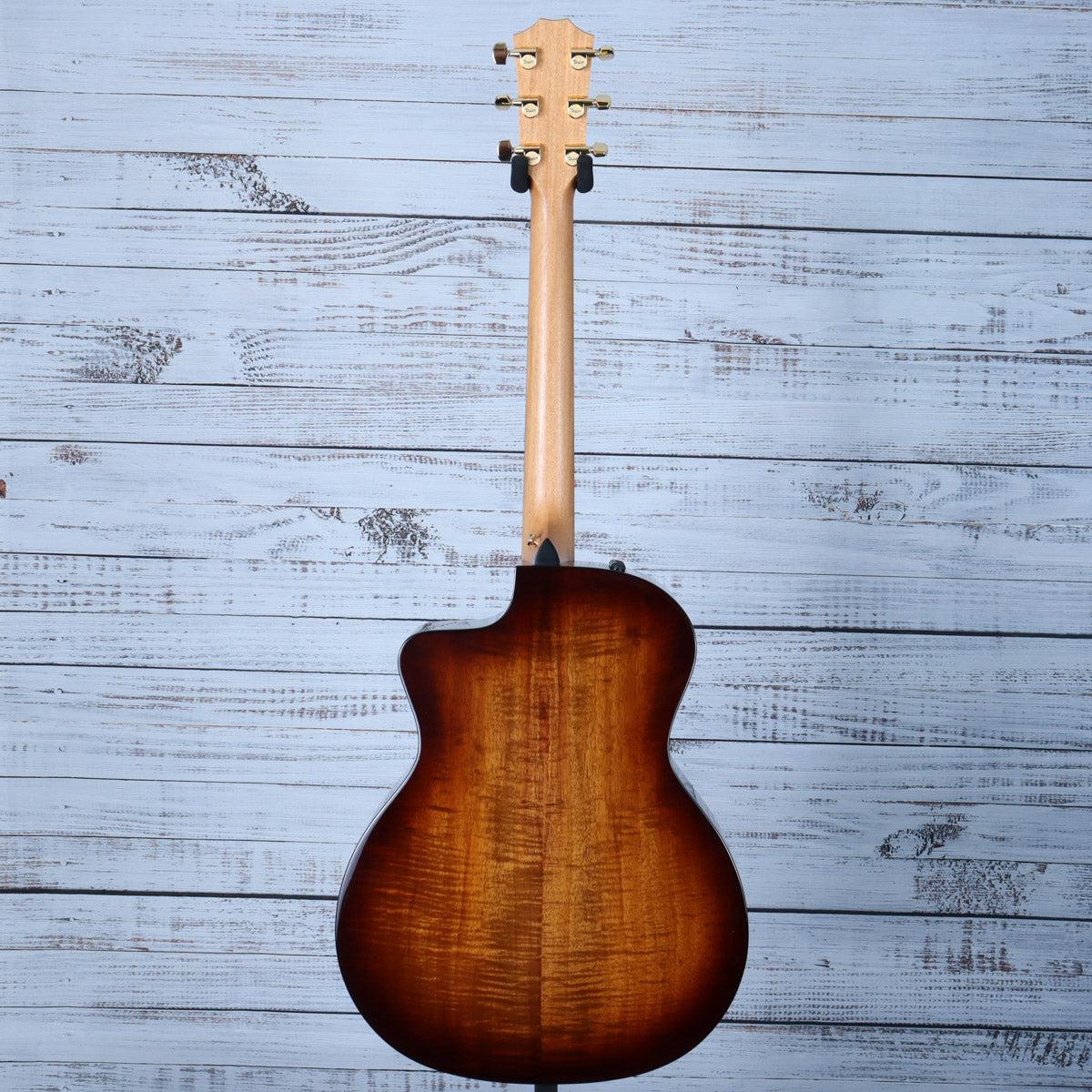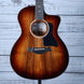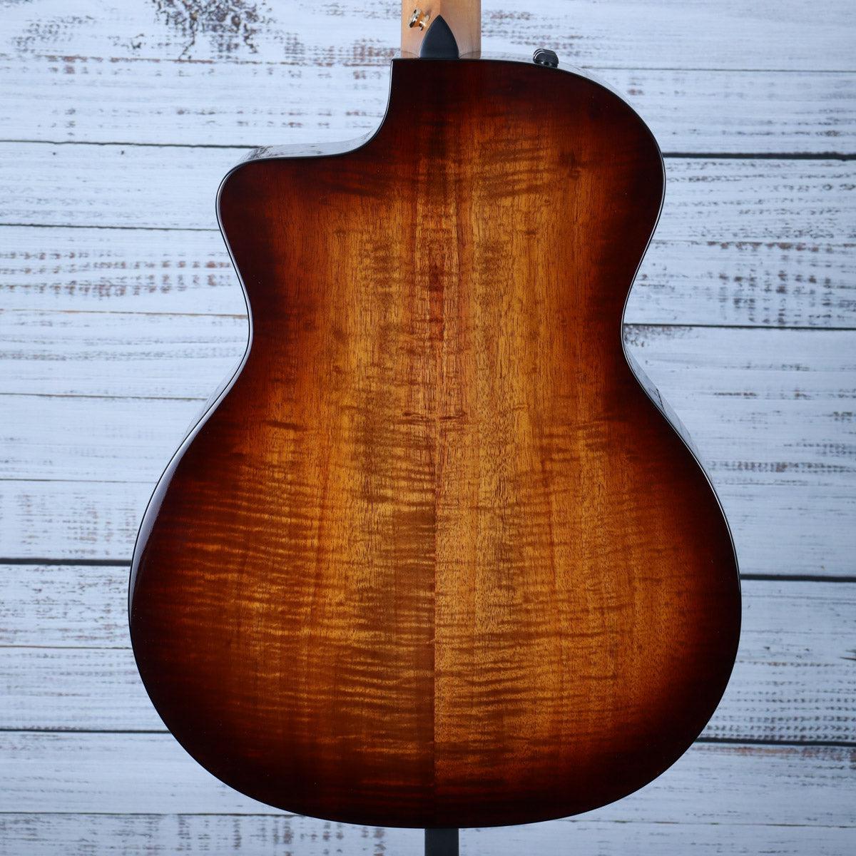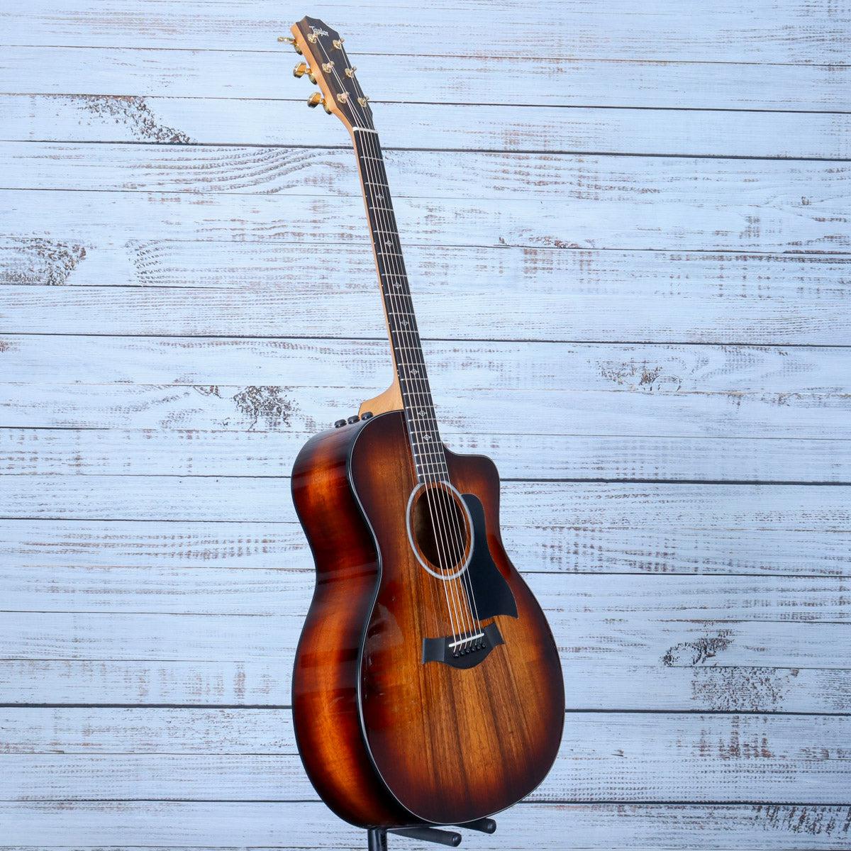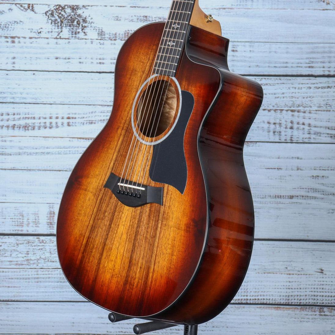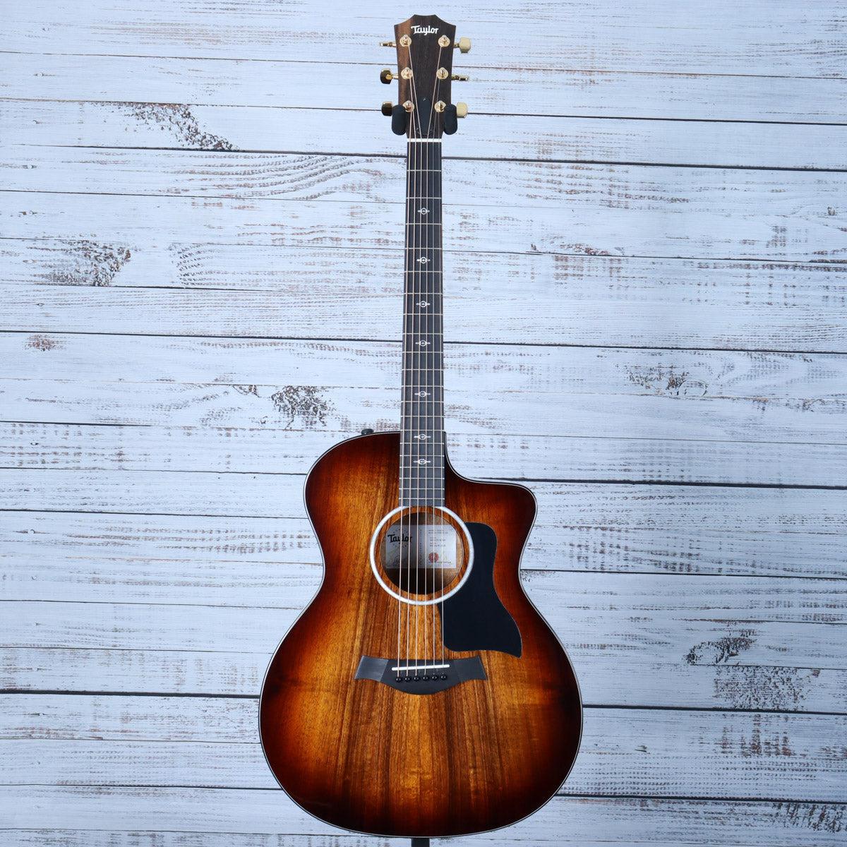 Expert players who appreciate the unique characteristics of Hawaiian koa wood will be impressed by the Taylor 224ce-K DLX acoustic-electric guitar. This Grand Auditorium model boasts a solid koa top and layered koa back and sides, providing a rich, lustrous midrange and sparkling top-end tone. The genuine ebony fretboard, slender Taylor neck, and Venetian cutaway all contribute to a comfortable playing experience with easy access to the highest frets. Its stunning full-body gloss finish in shaded edgeburst highlights koa's natural coloration. This model is equipped with ES2 electronics and includes a deluxe hardshell case.