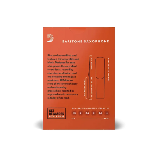 Rico by D'Addario Baritone Saxophone reeds are crafted with beginners and educators in mind, thanks to their traditional blank and profile for ease of response, plus unfiled cut for added support. These reeds are available for...Regular price $ 50.99Regular price $ 50.99
