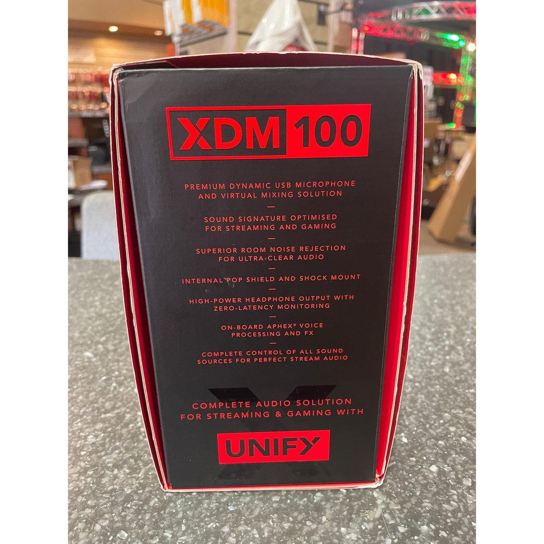 The XDM-100 is a professional dynamic USB microphone optimized for streaming and gaming. It delivers rich broadcast sound with superior room noise rejection: and features premium circuitry: including an ultra-low-noise: high-gain Revolution Preamp: and a zero-latency headphone output with level control and mute functionality. It also comes with a high-quality pop filter and shock mount. Importantly: the XDM-100 is fully compatible with UNIFY: which unlocks advanced APHEX audio processing: powered by internal DSP.