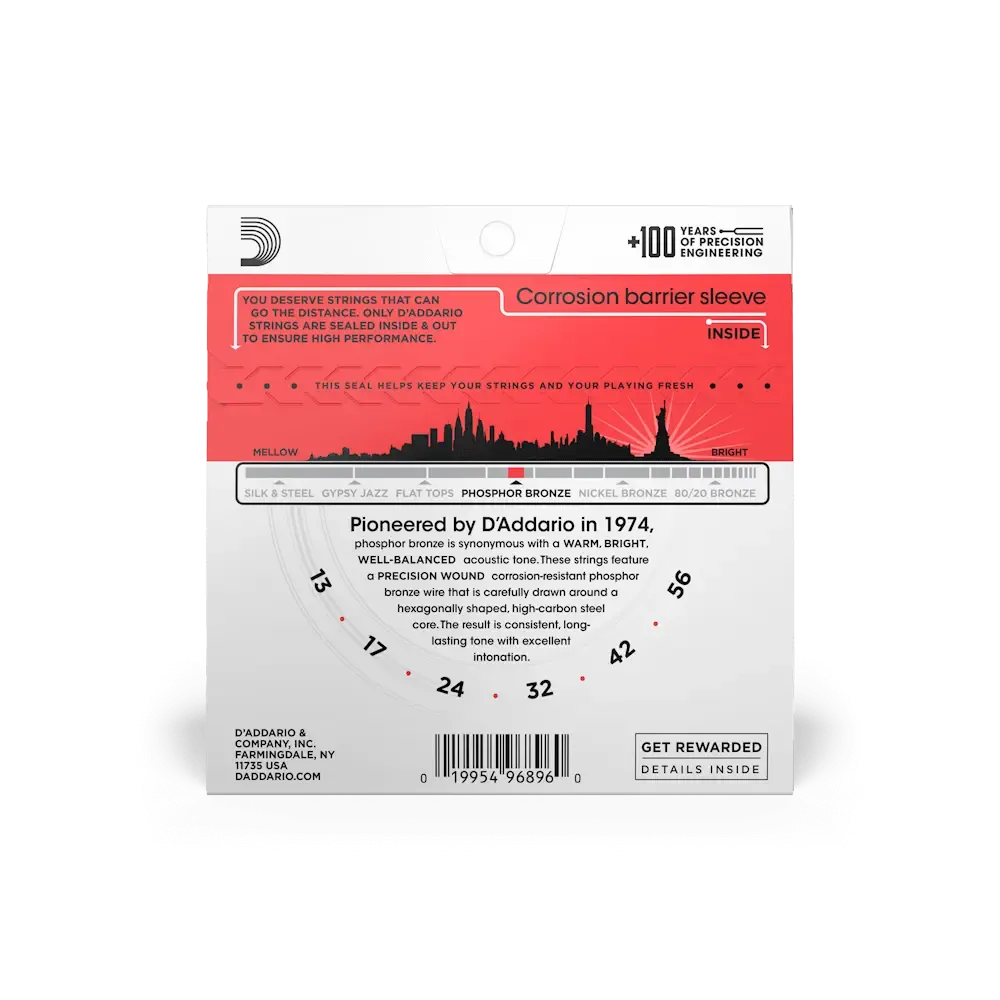 Phosphor Bronze is played throughout the world and considered to be the standard in acoustic strings, thanks to its beautiful sonic balance and tonal warmth. D'Addario's pioneering Phosphor Bronze acoustic guitar strings are precision wound with phosphor bronze wrap wire over a high-carbon steel core, providing tonal versatility suitable for all acoustic styles and musical genres.