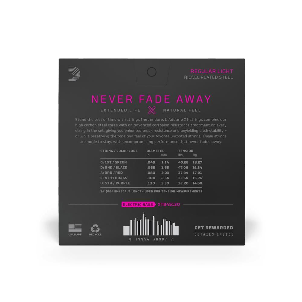 Made for 5-string basses, this 45-130 Regular Light gauge set takes D'Addario's most popular gauge and adds a low B-string.