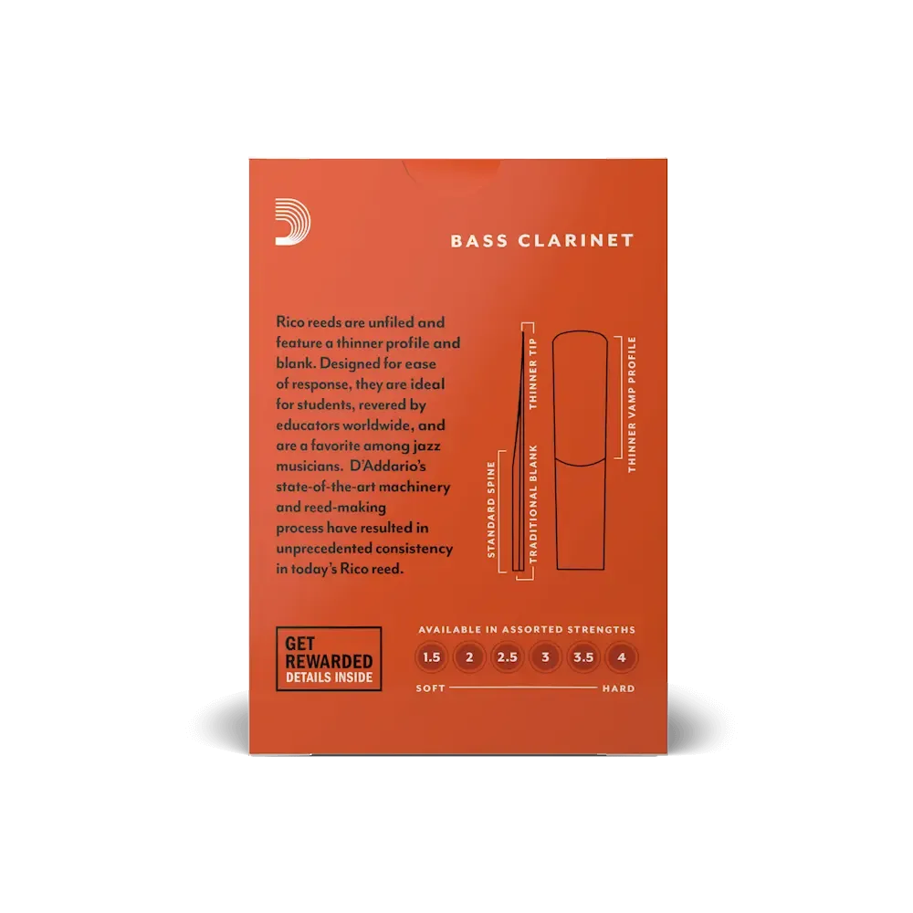 Rico by D'Addario Bass Clarinet reeds are crafted with beginners and educators in mind, thanks to their traditional blank and profile for ease of response, plus unfiled cut for added support. These reeds are available for a full range of clarinets and saxophones to best suit your playing needs.