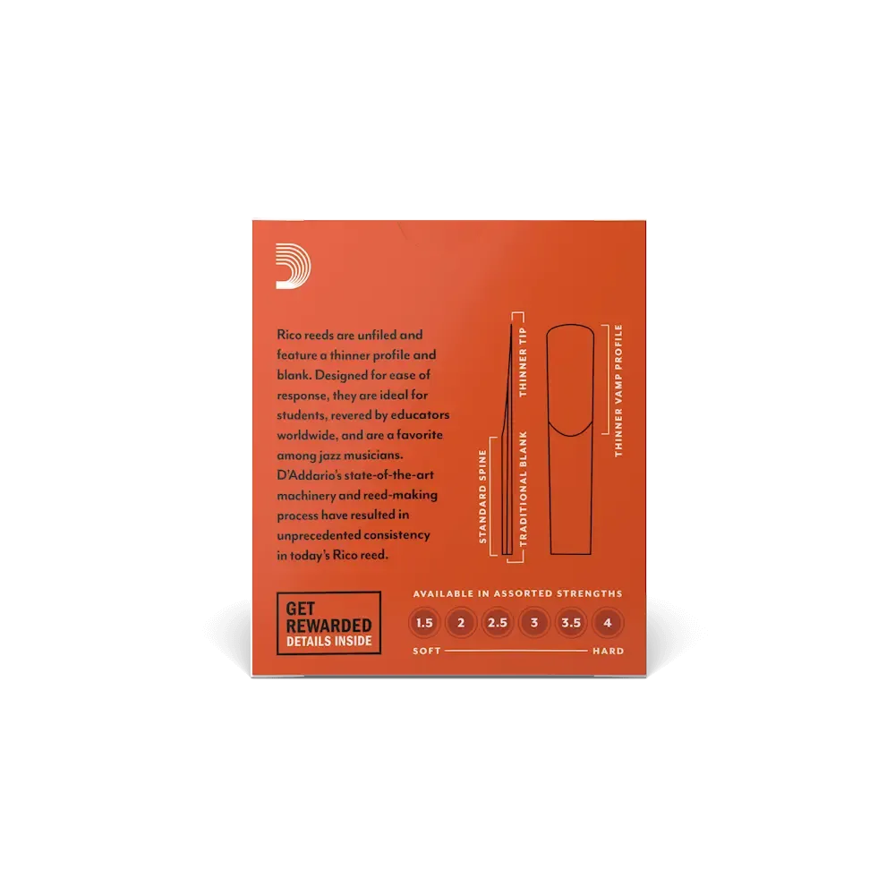 The Rico cut is unfiled and features a thinner profile and blank. Rico "Orange Box" reeds vibrate easily. They are a favorite among jazz musicians and are ideal for students. Rico's updated reed-making machinery and state-of-the-art process have made today's Rico reed more consistent than ever before. Affordably priced and conveniently packaged, Rico is the educator's choice.