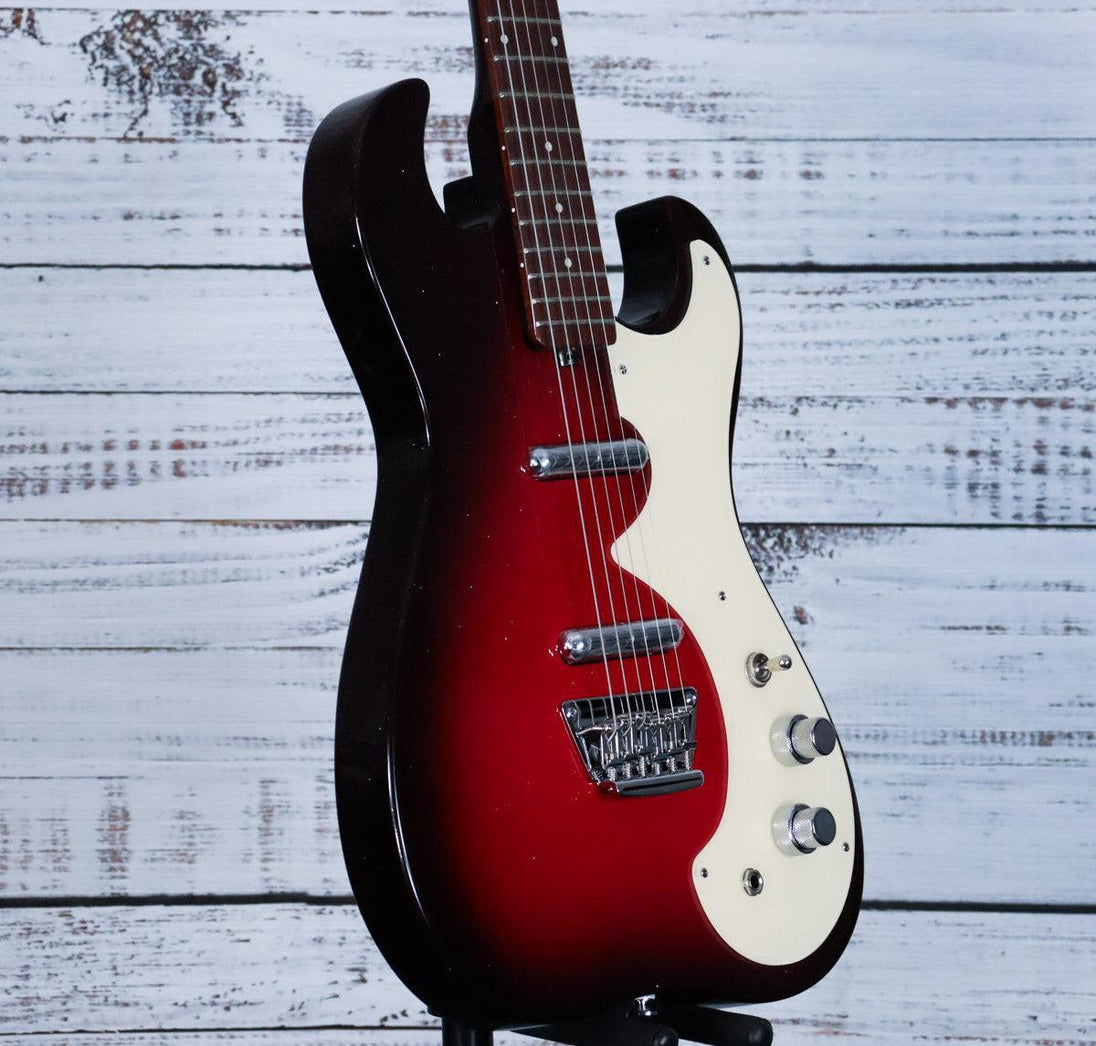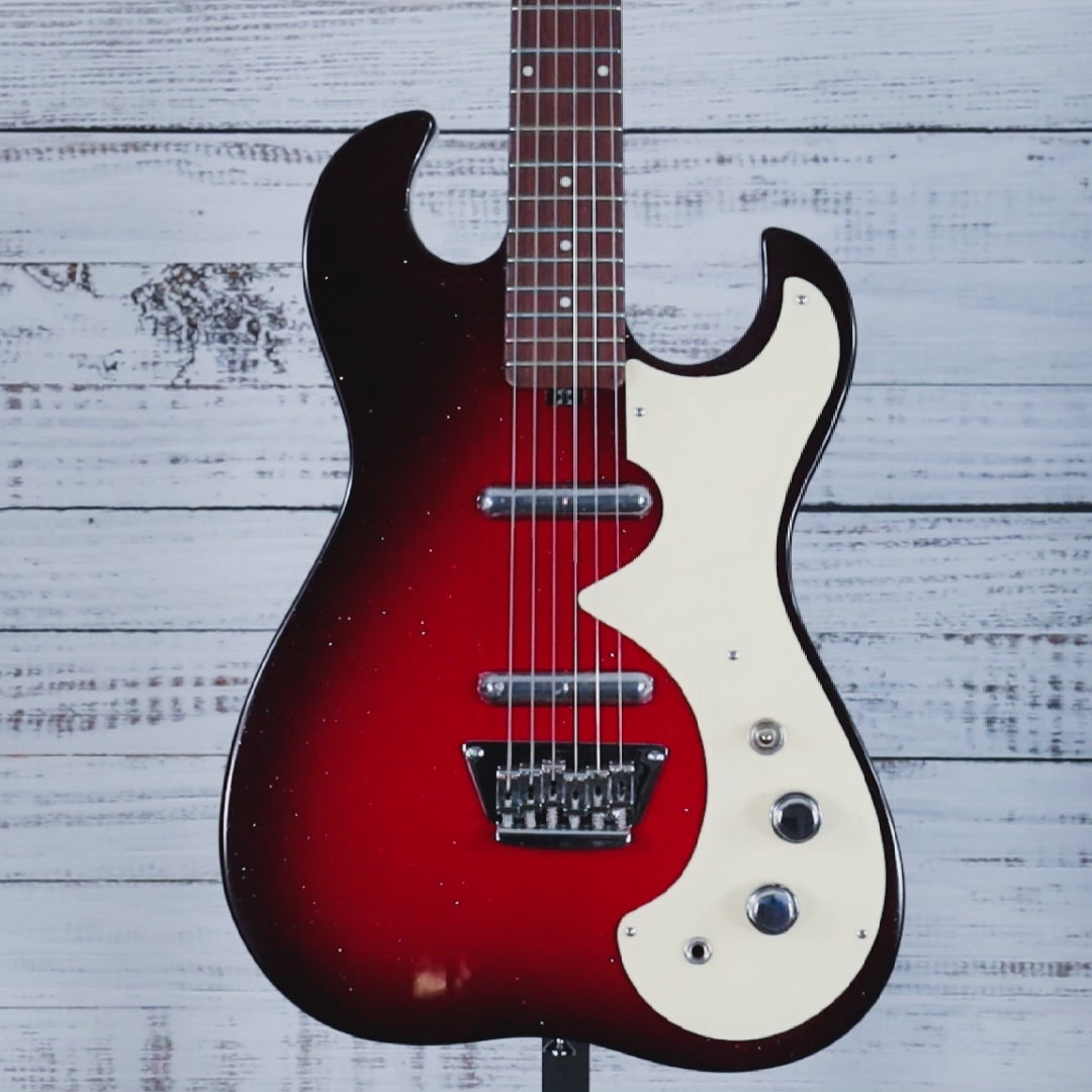 Get ready to rock with the Silvertone 1449 RSFB Electric Guitar in Red Silver Flake Burst. This classic design features a C-shaped neck with a modern 12" fingerboard radius. With its 2-pickup configuration and rare status, this guitar truly screams and will be sure to elevate your musical experience.