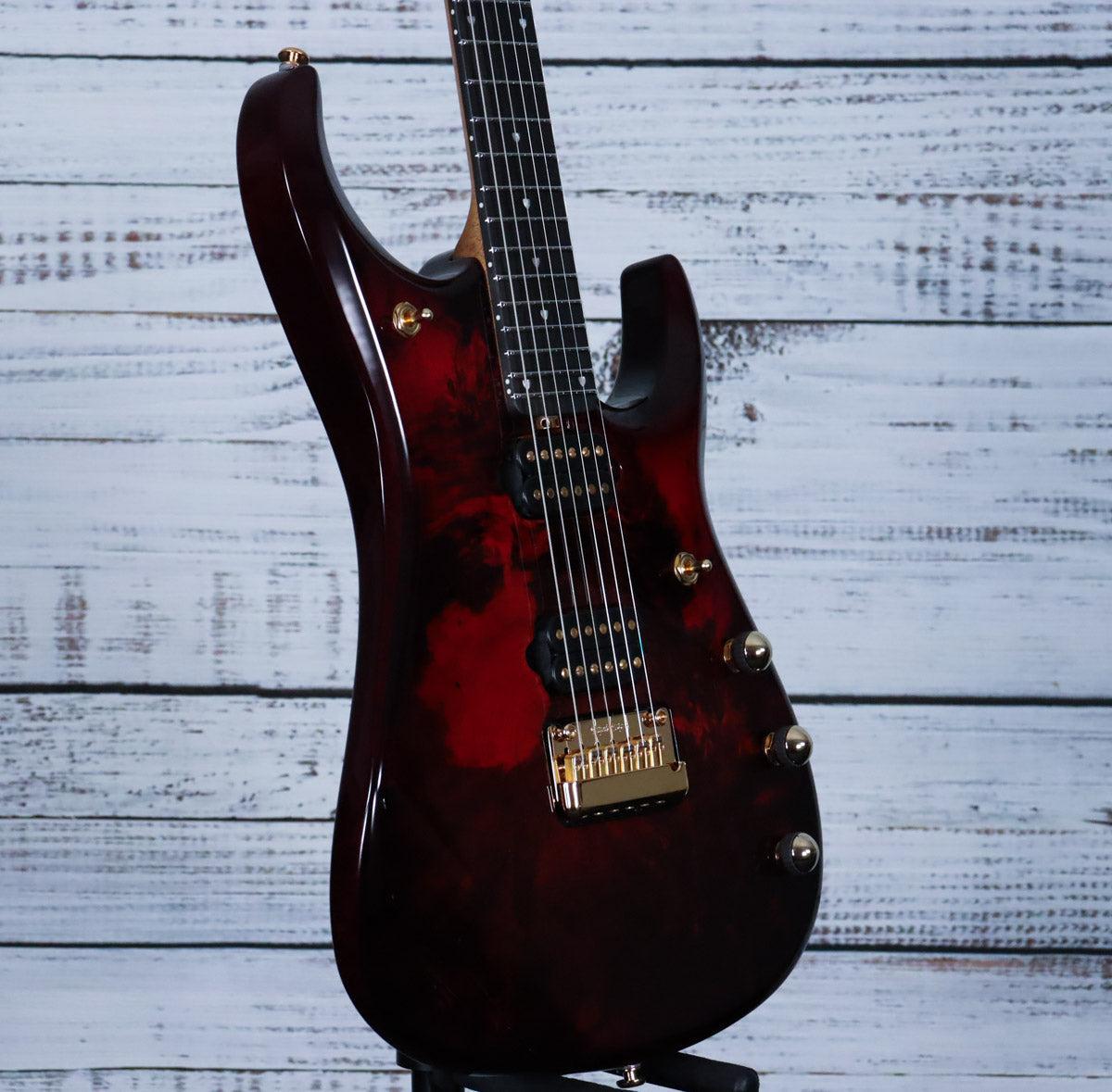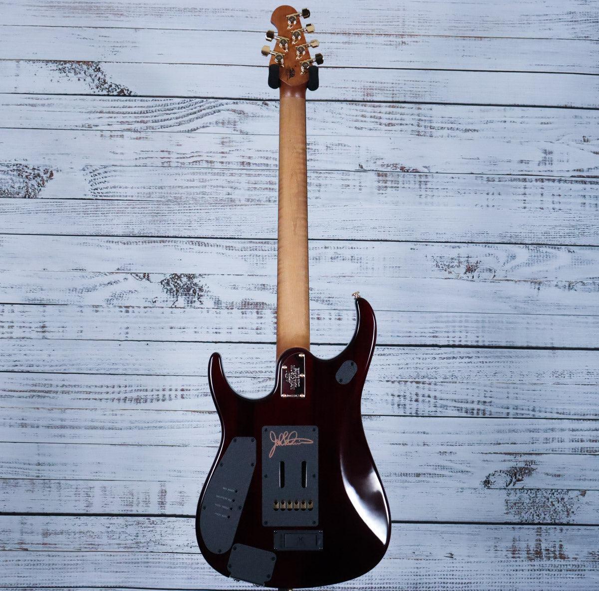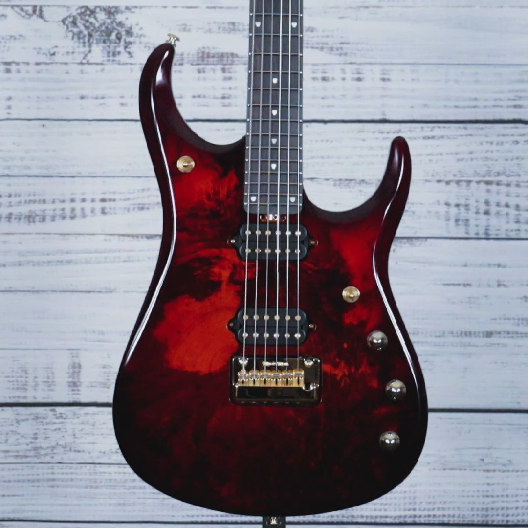 The limited edition Music Man JP15 BFR in Solar Flare features a black limba body topped with buckeye burl, creating a visually stunning instrument. Its thin, fast roasted figured maple neck with an ebony fretboard ensures exceptional playability and tonal clarity. Custom DiMarzio Sonic Ecstasy pickups combined with a piezo bridge system deliver rich electric and authentic acoustic sounds. The onboard 20dB gain boost and versatile mono/stereo output options, including separate piezo routing, provide professional-level flexibility for diverse playing styles. Limited to 100 units, this guitar blends craftsmanship and innovation for discerning musicians.