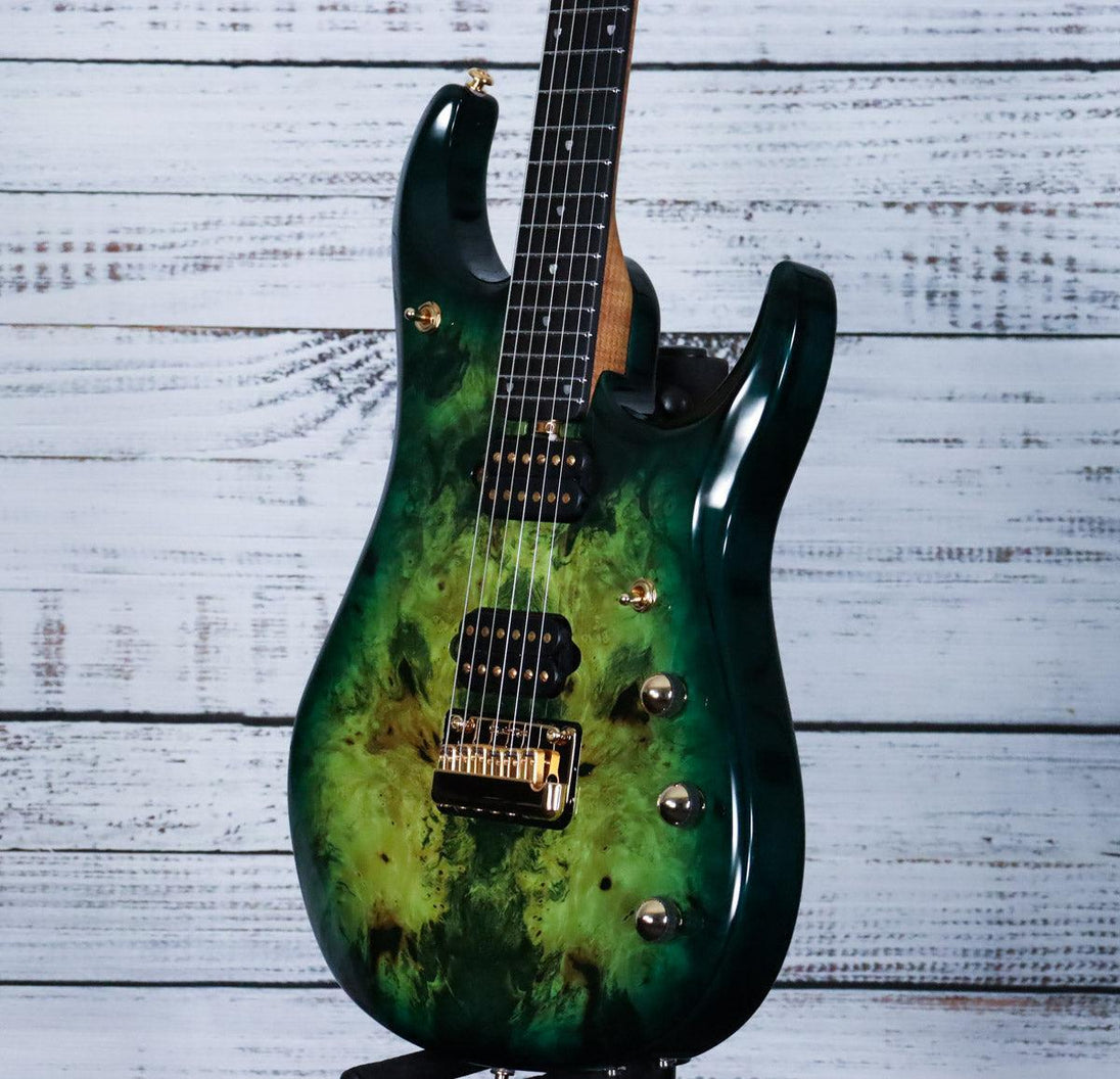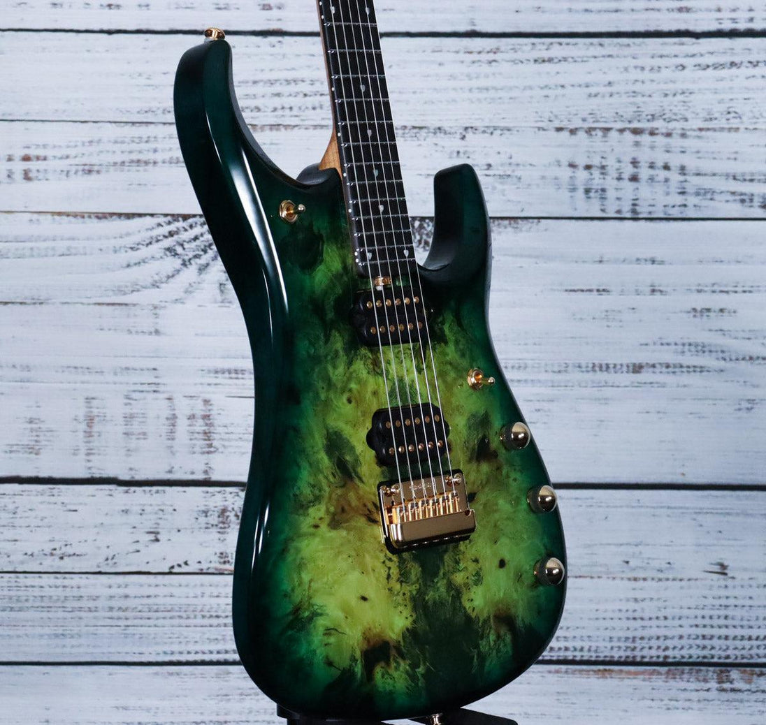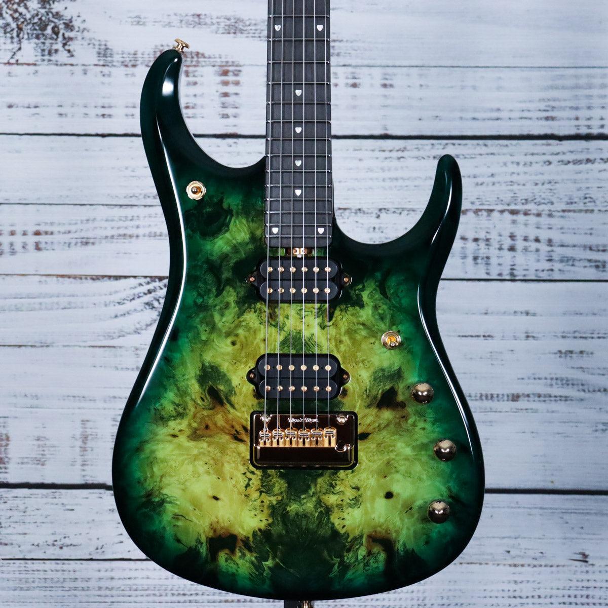 The limited-edition Music Man JP15 BFR in Toxic Sludge features a black limba body topped with buckeye burl, creating a visually stunning instrument. Its thin, fast roasted figured maple neck with an ebony fretboard ensures exceptional playability and tonal clarity. Custom DiMarzio Sonic Ecstasy pickups combined with a piezo bridge system deliver rich electric and authentic acoustic sounds. The onboard 20dB gain boost and versatile mono/stereo output options, including separate piezo routing, provide professional-level flexibility for diverse playing styles. Limited to 100 units, this guitar blends craftsmanship and innovation for discerning musicians.