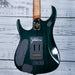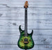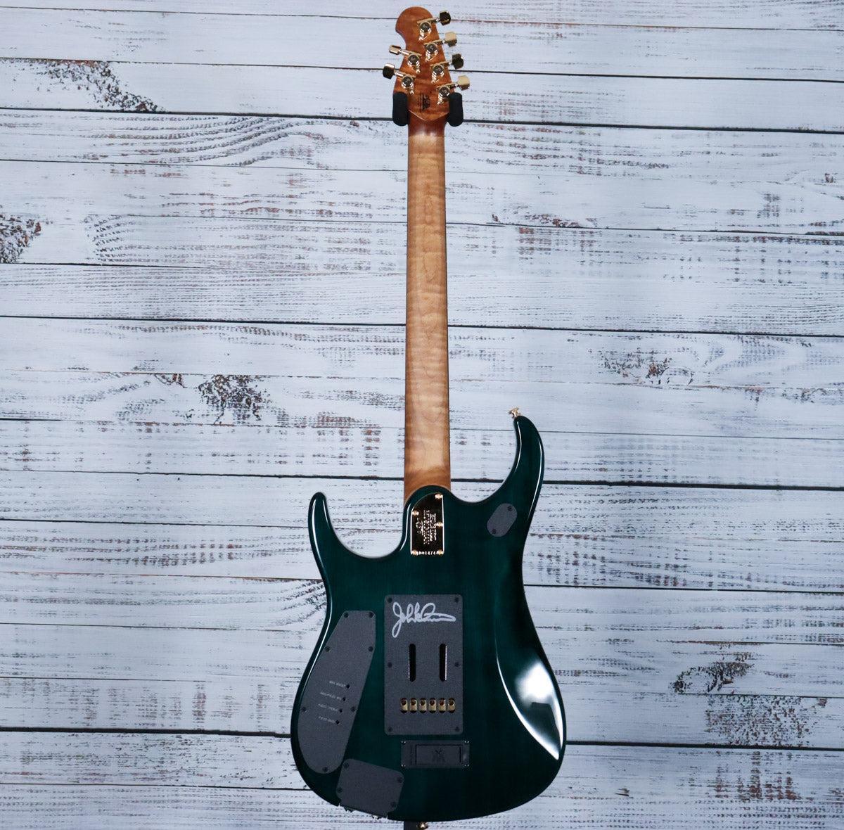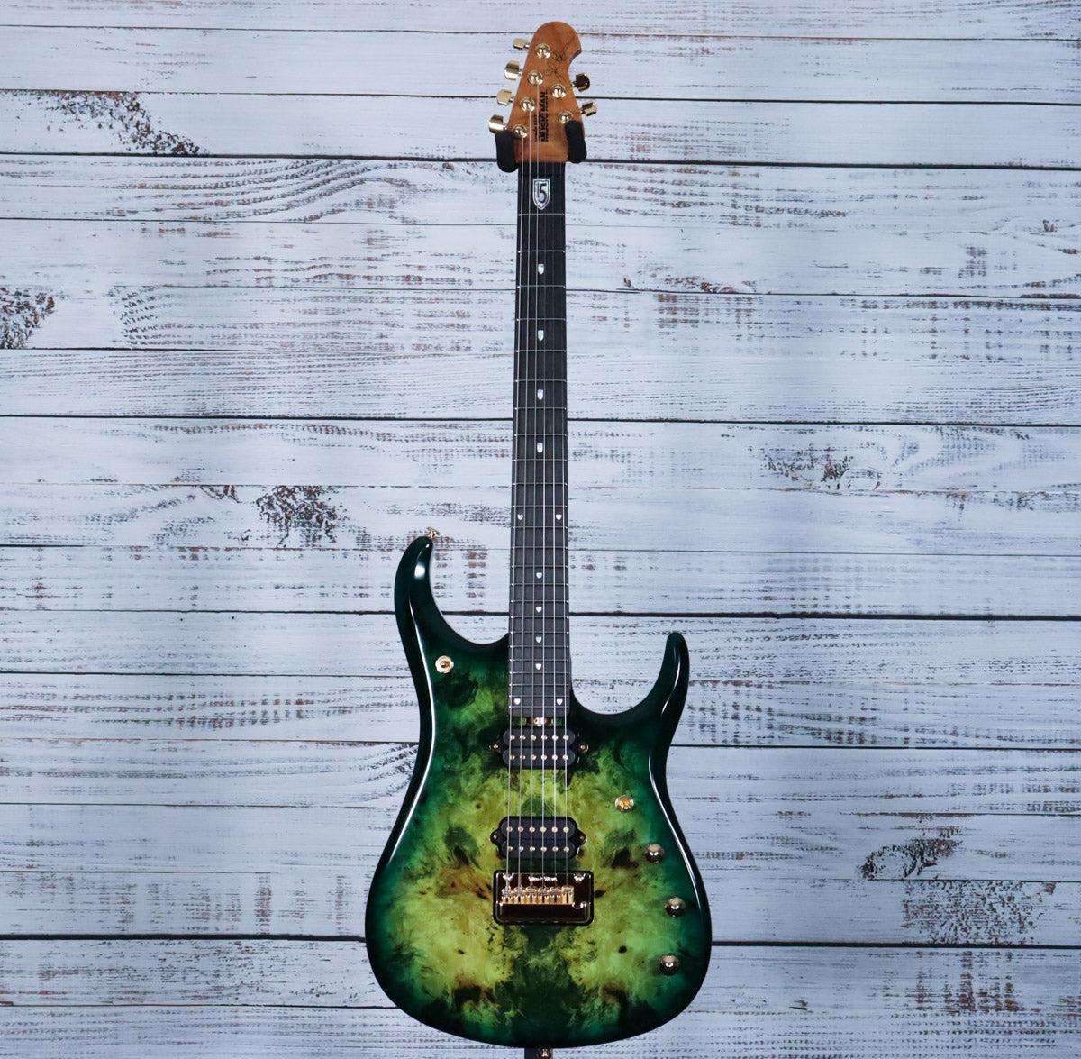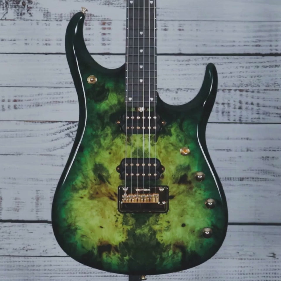 The limited-edition Music Man JP15 BFR in Toxic Sludge features a black limba body topped with buckeye burl, creating a visually stunning instrument. Its thin, fast roasted figured maple neck with an ebony fretboard ensures exceptional playability and tonal clarity. Custom DiMarzio Sonic Ecstasy pickups combined with a piezo bridge system deliver rich electric and authentic acoustic sounds. The onboard 20dB gain boost and versatile mono/stereo output options, including separate piezo routing, provide professional-level flexibility for diverse playing styles. Limited to 100 units, this guitar blends craftsmanship and innovation for discerning musicians.
