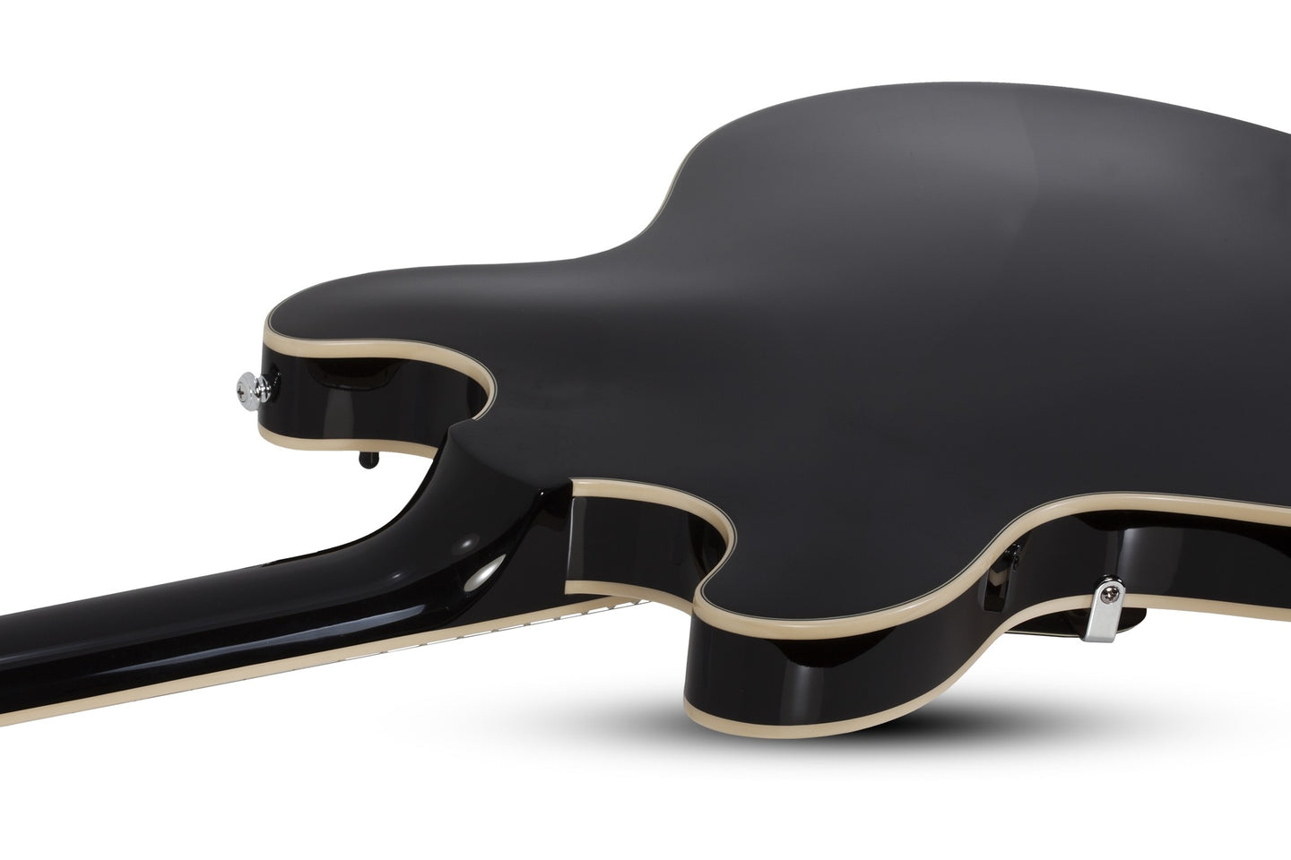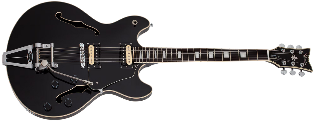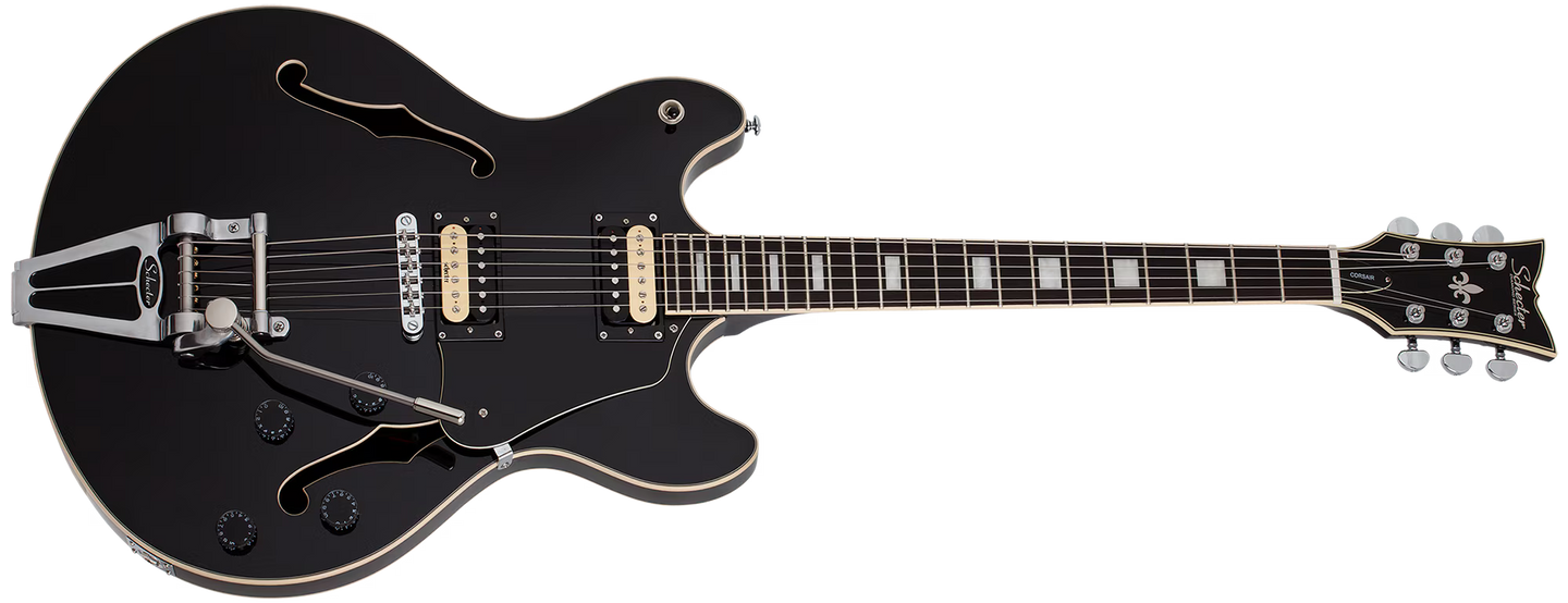 The perfect blend of vintage style and modern craftsmanship with the Corsair in Gloss Black. Featuring a full hollow body, Schecter USA pickups, and classic appointments like Bigsby tremolos and lipstick pickups, this guitar delivers rich tones and striking aesthetics. Designed for niche players who appreciate retro flair and exceptional quality, the Corsair stands out both on stage and in your collection.
