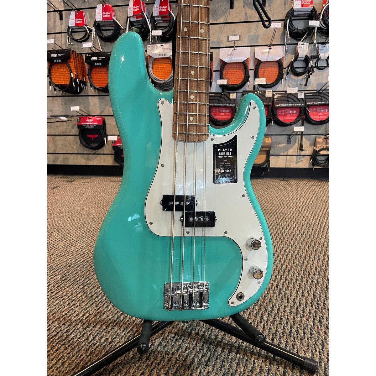 Experience the timeless elegance of a Fender electric bass with the Player Precision Bass. Authentic Fender style combined with a deep, resonating sound sets this bass apart from the rest. Effortlessly glide through your performance with its smooth playability and eye-catching design, capturing the hearts of your audience. Our commitment to honoring our roots while embracing innovation is reflected in the Player Series split-coil Precision Bass middle pickup, known for its signature Fender bass tone. Easily shape your sound with the convenient master volume and tone controls. The maple neck with a "Modern C" shape and 9.5"-radius fingerboard featuring 20 medium-jumbo frets is suitable for any playing style. Plus, the 4-saddle bridge offers precise intonation and adjustable action, making it the perfect choice for personalizing your playing experience.
