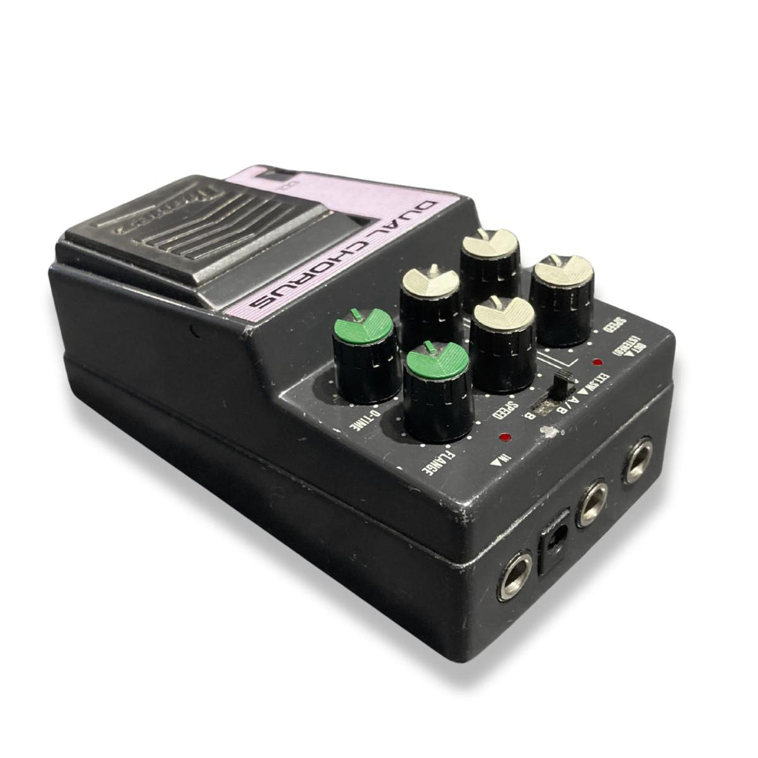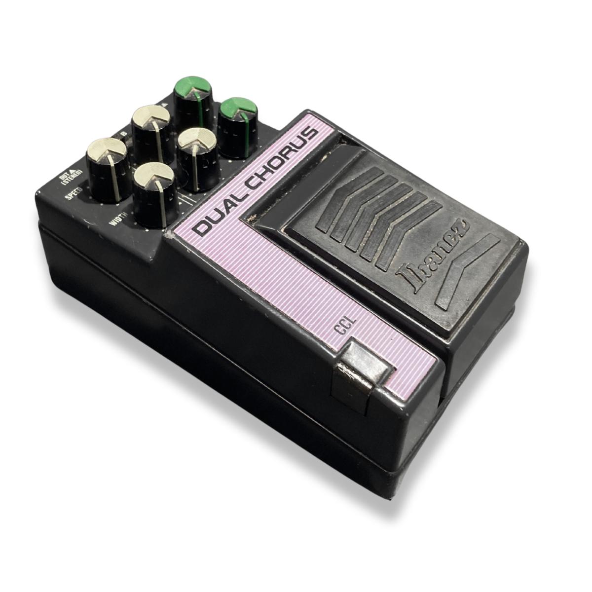 The Ibanez Dual Chorus pedal uniquely combines chorus and flanger effects in one versatile unit from the 1980s Master (L) Series, positioned between the 9 and 10 series. Its design allows independent activation of each effect or seamless switching between them using the internal footswitch. Additionally, a separate footswitch offers convenient on/off control without interrupting mode selection, making it a rare and flexible tool for refined tone shaping.