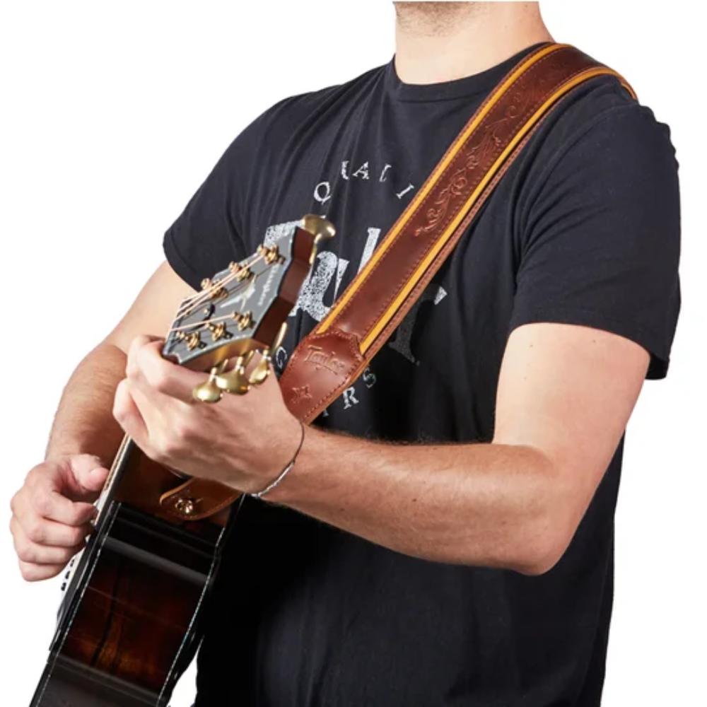 The Taylor Nouveau Leather Guitar Strap boasts an elegant multilayered medium brown color with butterscotch trim. Artfully detailed with our Nouveau inlay motif and an embossed Taylor logo, it's the perfect complement to virtually any acoustic guitar. At 2.5" wide, this strap is designed to provide hours of comfortable playing time thanks to extra shoulder support.