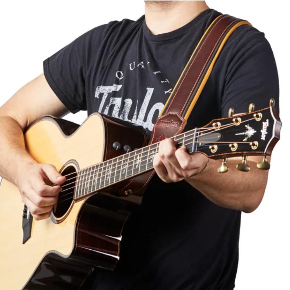 The Taylor Ascension Leather Guitar Strap provides our highest level of comfort. Its unique cordovan color with butterscotch and black leather trim makes it one of our sharpest straps, detailed with Taylor's Ascension motif that perfectly complements guitars from the 900 Series.