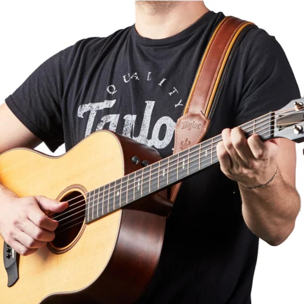 The Taylor Century Leather Guitar Strap emphasizes comfort alongside a classic aesthetic appeal. Available in medium brown with butterscotch/black leather trim or with cordovan/ivory leather trim, this lovingly appointed strap features an embossed Taylor logo and our Century motif, making it a great match for any 500 Series Taylor guitar. At 2.5" wide, the Taylor Century strap provides the perfect balance of comfort and support.
