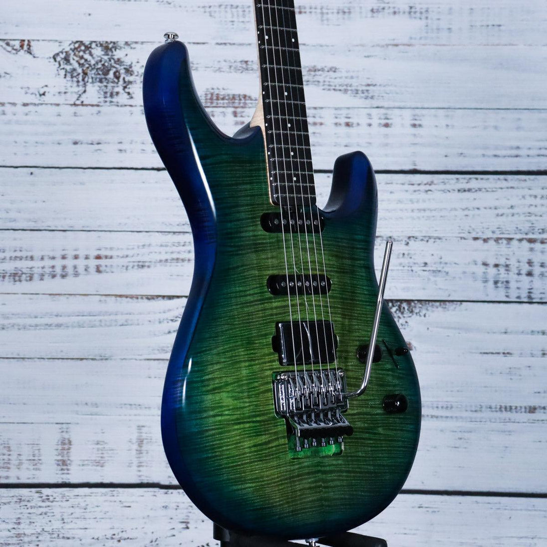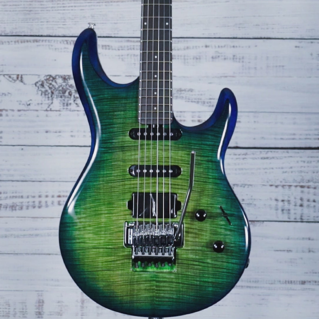 Expertly crafted by Ball Family Reserve, the Music Man Luke 4 HSS features an okoume body with a stunning flame maple top in Green Tide. Complete with a white figured maple neck and ebony fretboard, it is equipped with Music Man HT pickups and the Silent Circuit for reduced hum. With a 12dB gain boost and double-locking tremolo system, this exclusive guitar is perfect for any professional musician. Limited to only 150 units, each comes with a signed tremolo cover by Steve Lukather and a Certificate of Authenticity.