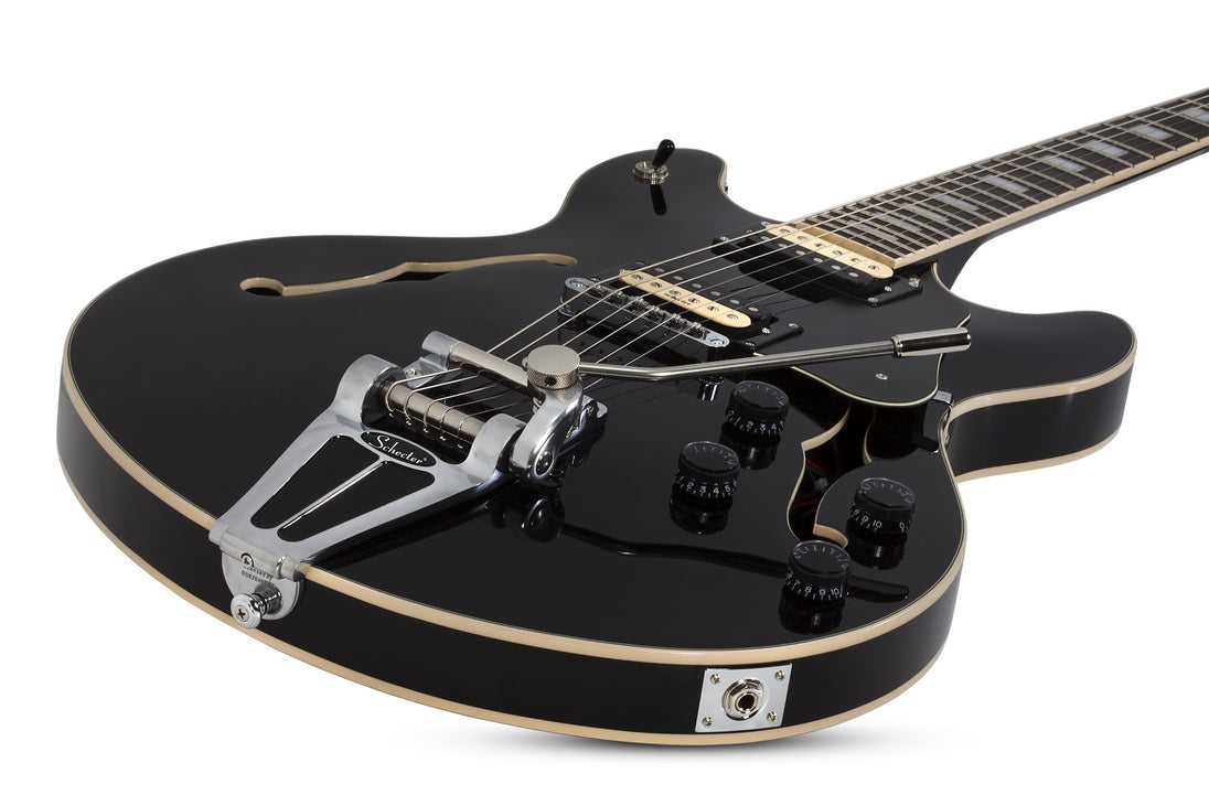 The perfect blend of vintage style and modern craftsmanship with the Corsair in Gloss Black. Featuring a full hollow body, Schecter USA pickups, and classic appointments like Bigsby tremolos and lipstick pickups, this guitar delivers rich tones and striking aesthetics. Designed for niche players who appreciate retro flair and exceptional quality, the Corsair stands out both on stage and in your collection.