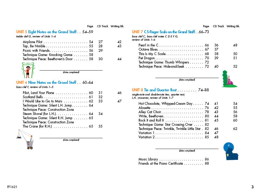 Book B of the Fabers' method for the young beginner moves the student into staff-reading. Music notation is explored through stepwise directional reading, pattern recognition, and changing hand positions, all in the context of engaging songs, games and creative exploration at the piano.