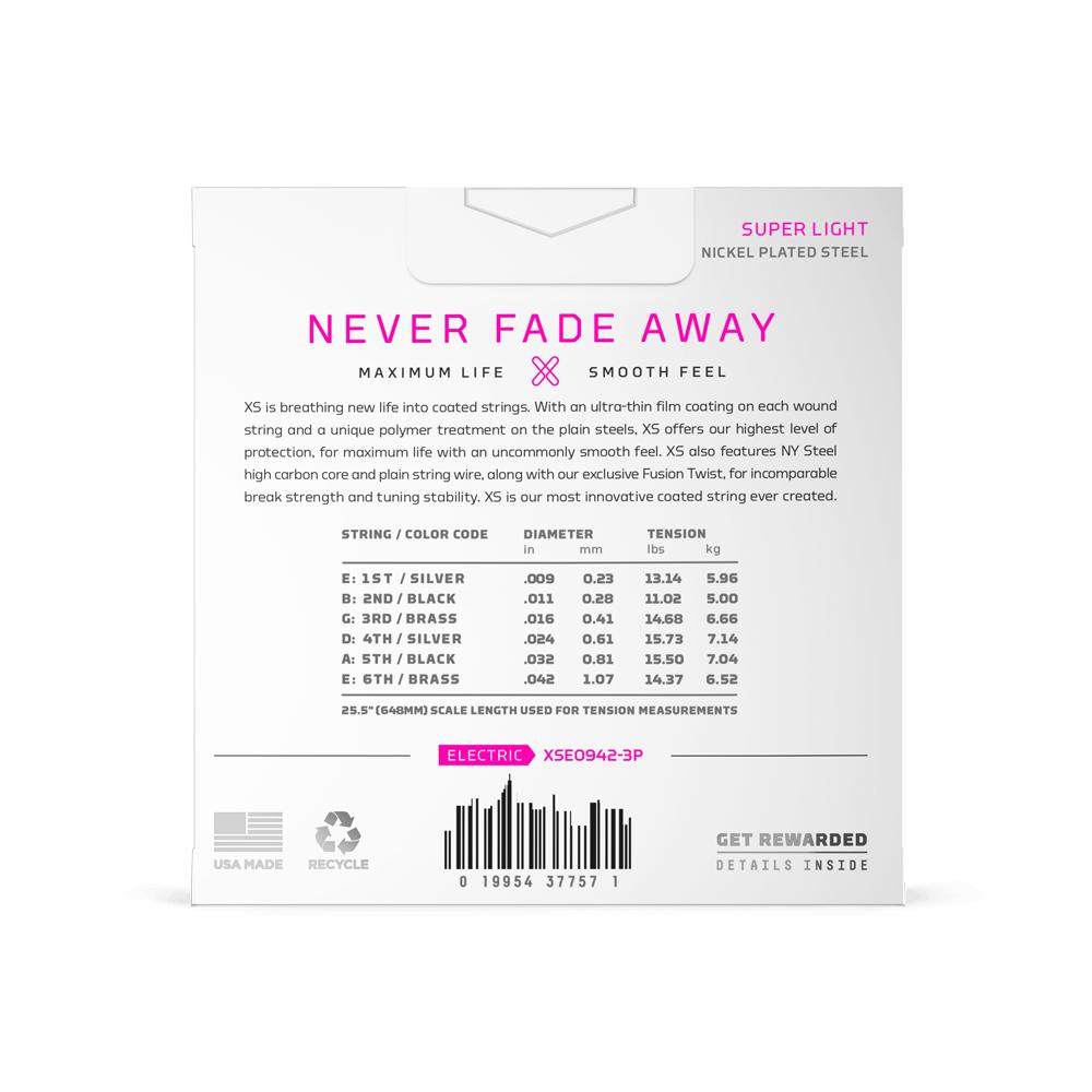 Experience the longest life and superior quality with D'Addario XS Nickel Plated Steel electric guitar strings. The groundbreaking XS coating and NY Steel core provide maximum durability and a smooth, fast feel. Fusion Twist technology adds strength and tuning stability.