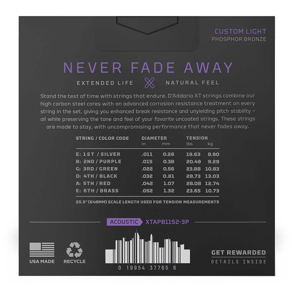 Get the warm, balanced tone you love with D'Addario XT Acoustic Phosphor Bronze strings. These strings offer enhanced break resistance, pitch stability, and longer life. The advanced corrosion resistance of the coating and the NY Steel core provide added resilience, making them perfect for a variety of acoustic styles.
