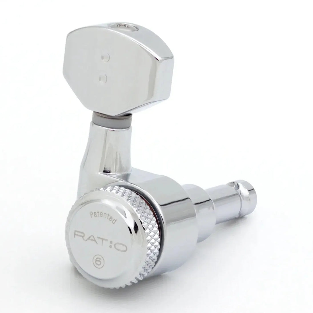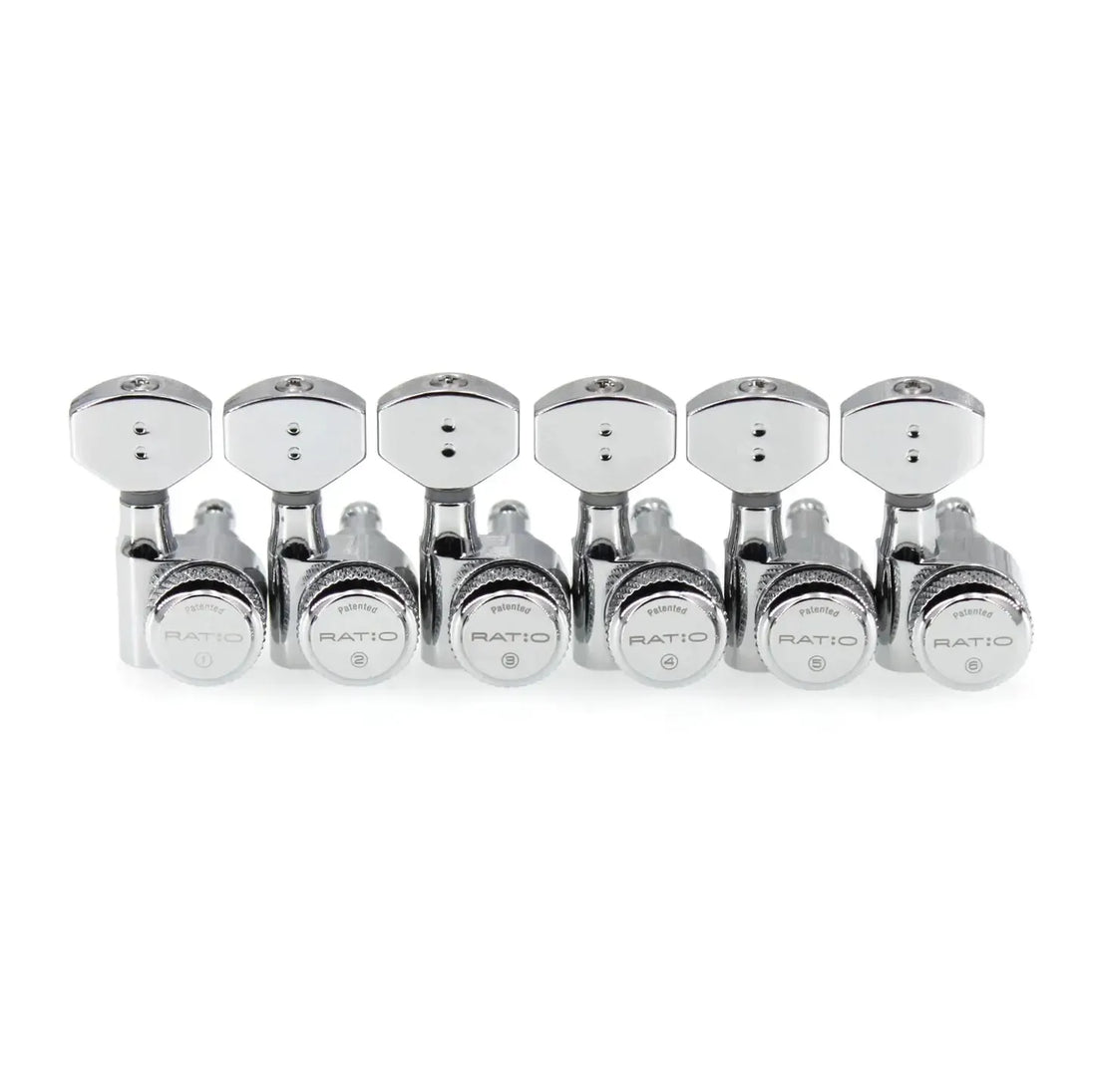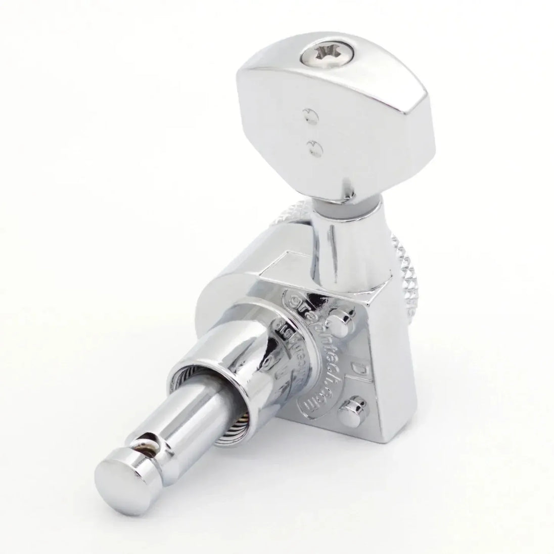 The PRL-9721-C are precision-engineered locking machine heads designed for 6-in-line electric guitars. Featuring staggered posts, they eliminate the need for a string tree, ensuring smoother tuning and enhanced string tension. Their two-pin casing allows direct installation or compatibility with Graph Tech’s patented InvisoMatch mounting plates, included in four brushed aluminum sets for quick, accurate fitting using existing screw holes. These tuners provide reliable tuning stability and streamlined installation tailored for left-handed players seeking professional-grade performance.