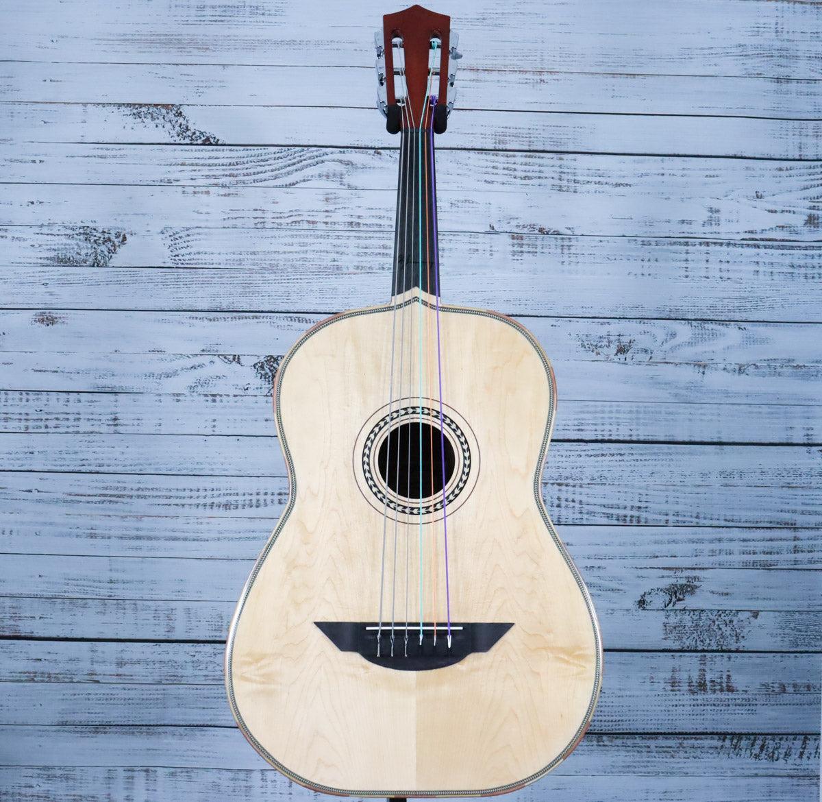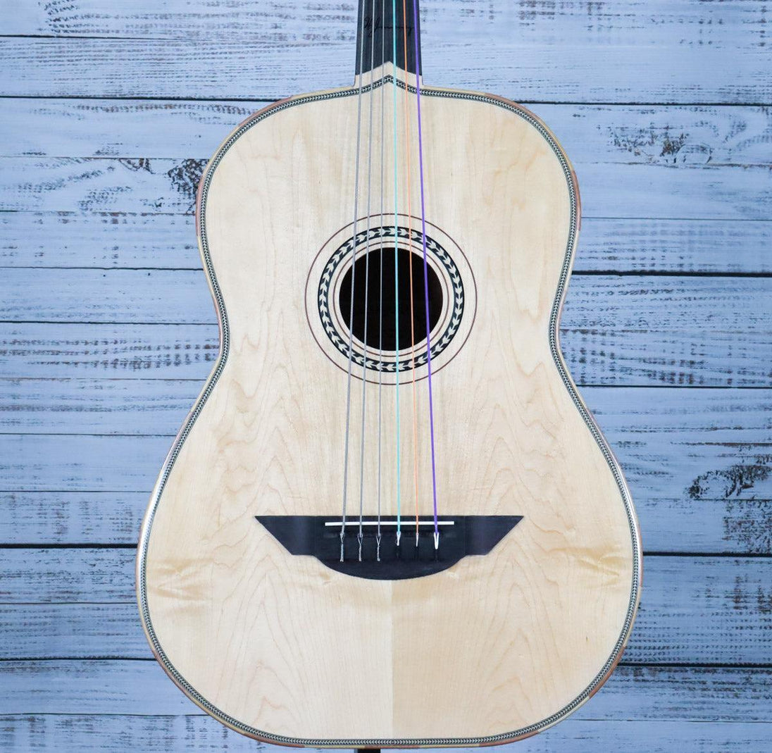 The H. Jimenez LGTN2 Standard Series Full Size Guitarrón combines traditional craftsmanship with durable materials for reliable performance. Its body features hand-fitted alternating maple and mahogany edges, with laminated Luan back and sides and a laminated basswood top for lasting strength. The ovangkol fingerboard showcases the signature H. Jimenez laser logo and arrow rosette, while the custom Ovangkol Thunderwing™ bridge saddle ensures optimal string action. Smooth-action tuners provide precise and effortless tuning, making this guitarrón an excellent choice for serious musicians seeking quality and consistency.