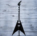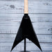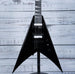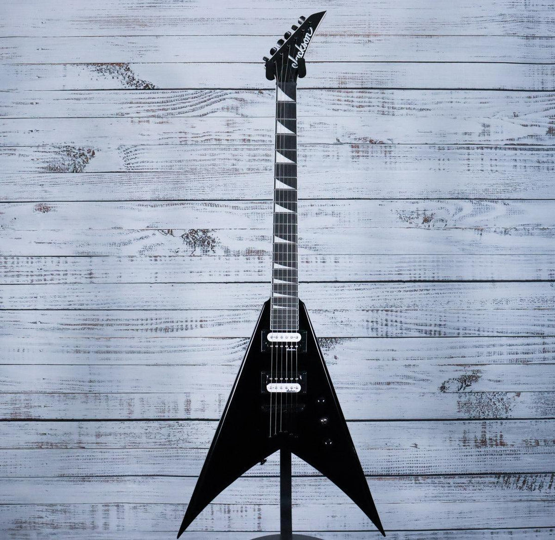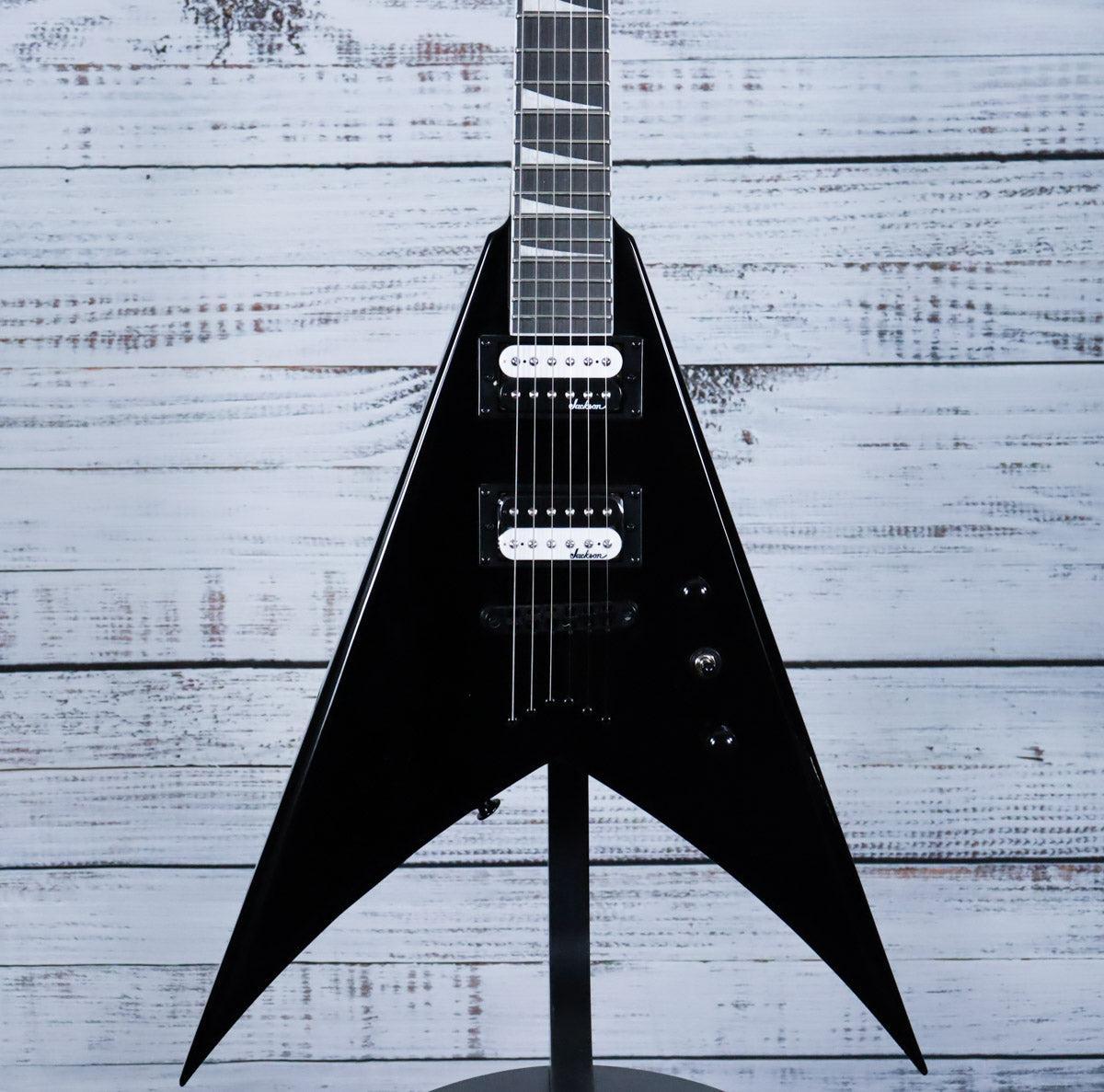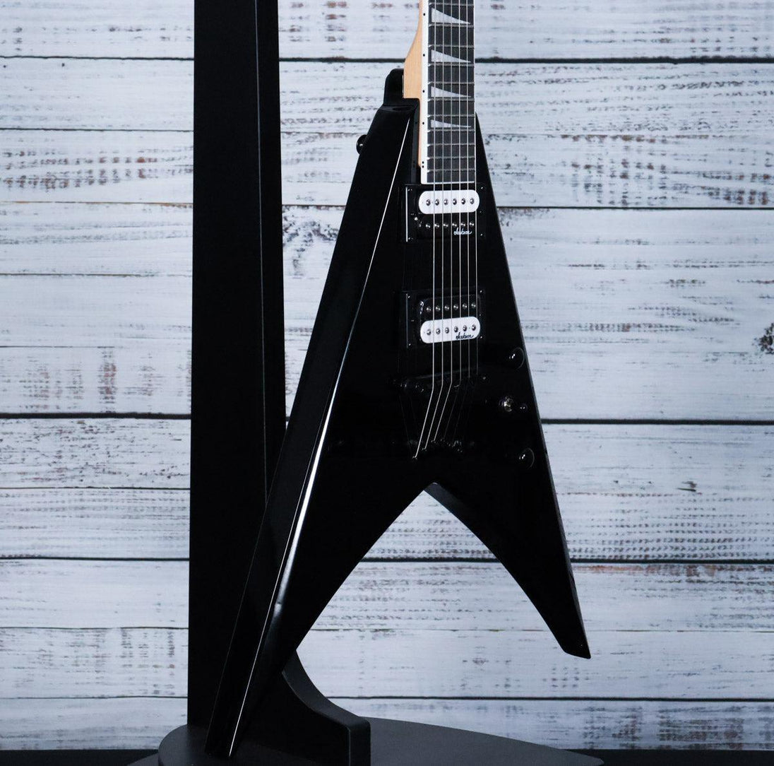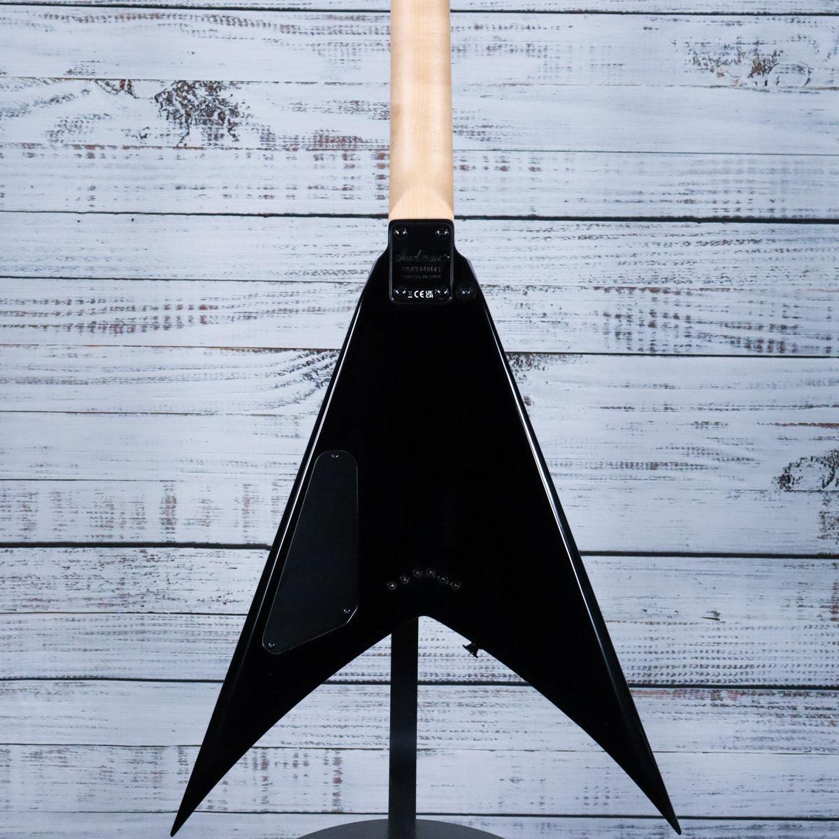 The Jackson JS Series King V JS32T in Gloss Black delivers a powerful performance with its poplar body and bolt-on maple speed neck reinforced with graphite for stability. Its 12"-16" compound radius amaranth fingerboard features 24 jumbo frets and pearloid sharkfin inlays, enhancing playability. Equipped with dual high-output ceramic-magnet humbuckers and a three-way toggle switch, it offers versatile tonal options. The adjustable string-through-body bridge ensures precise intonation, while die-cast tuners and all-black hardware complete this swift, aggressive instrument designed for serious players.