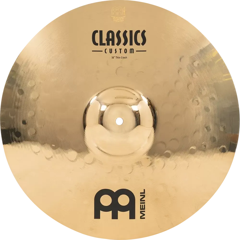 The 16" Meinl Classics Custom Brilliant Thin Crash offers a lightweight design that allows for quick response and open, expressive sound featuring dark undertones and warm tonality. Its softer stick feel makes it particularly approachable for playing at low to medium volumes, making it ideal for nuanced dynamics. This versatile crash excels in a variety of settings, from intimate club gigs to detailed home studio sessions.