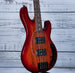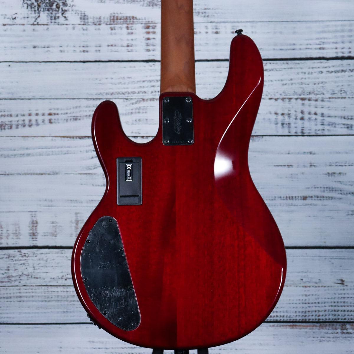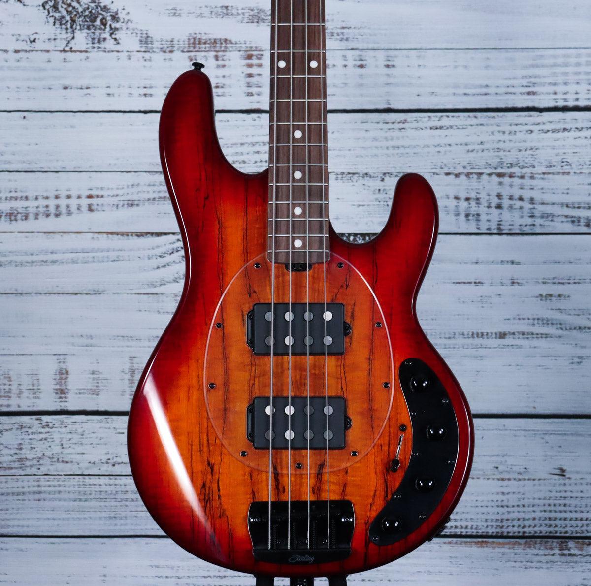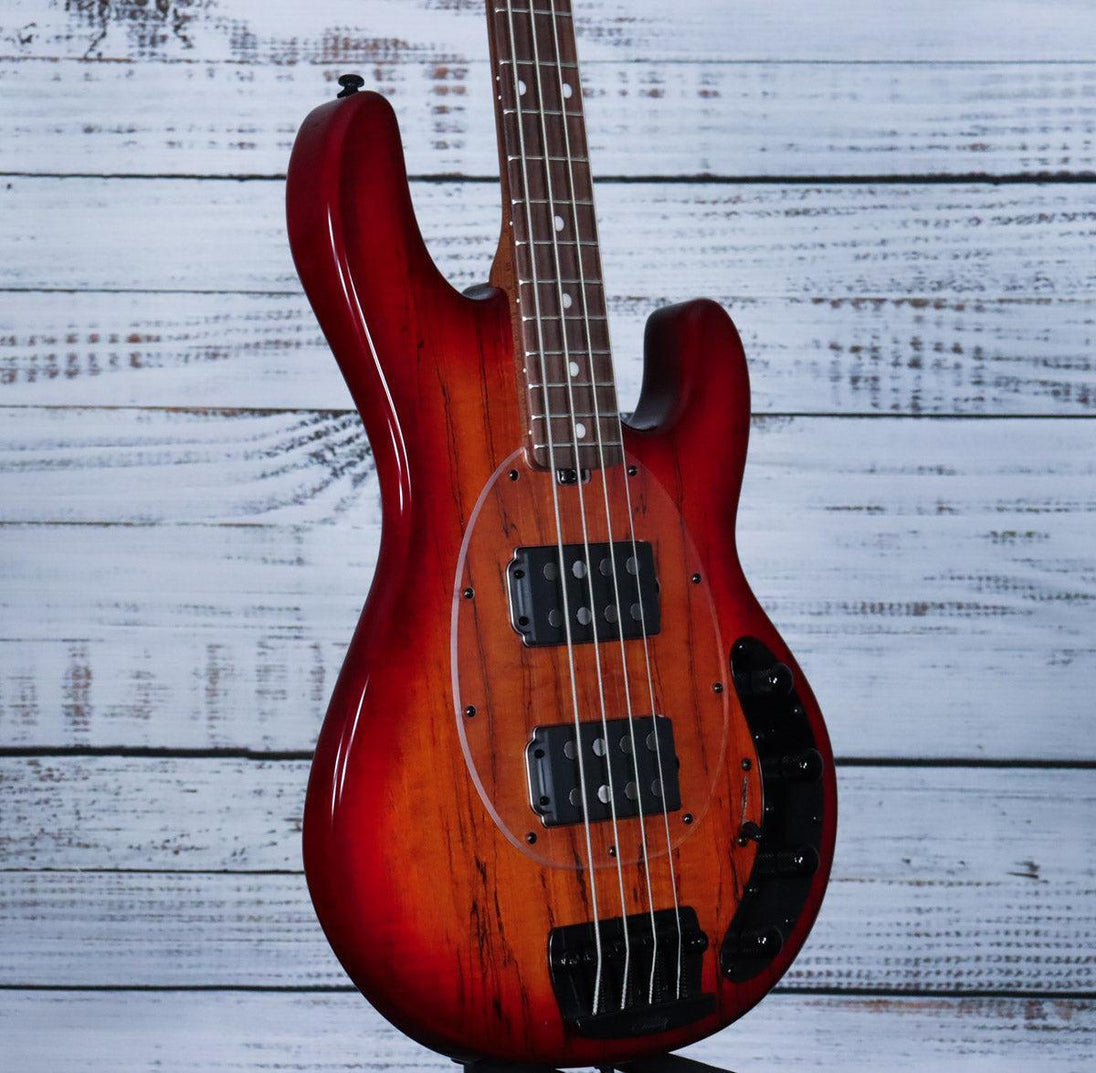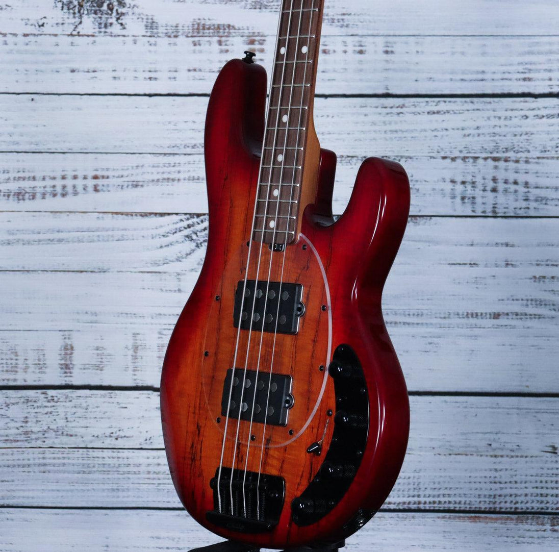 The Sterling Stingray HH Maple Top 4-string Bass in Blood Orange Burst combines classic design with modern features for professional players. It boasts a roasted maple neck for enhanced stability and warmth, while its spalted maple veneer top adds striking visual appeal. Equipped with dual humbuckers and a 3-band active preamp, this bass delivers versatile tone shaping and rich sound. The modern contoured body and an Ernie Ball Music Man StingRay–style bridge ensure comfortable playability and precise intonation, making it an ideal choice for serious bassists seeking both performance and style.