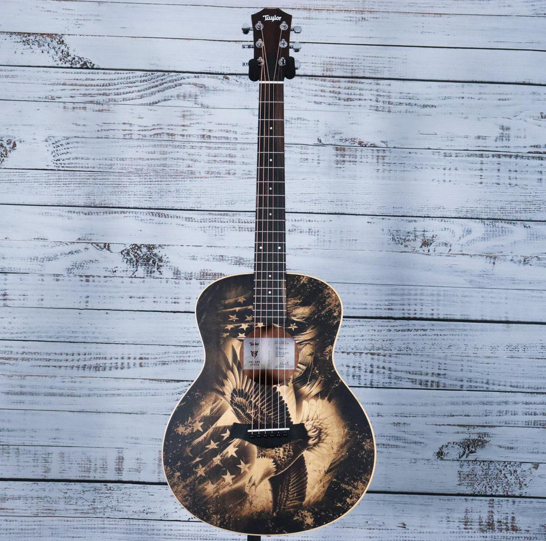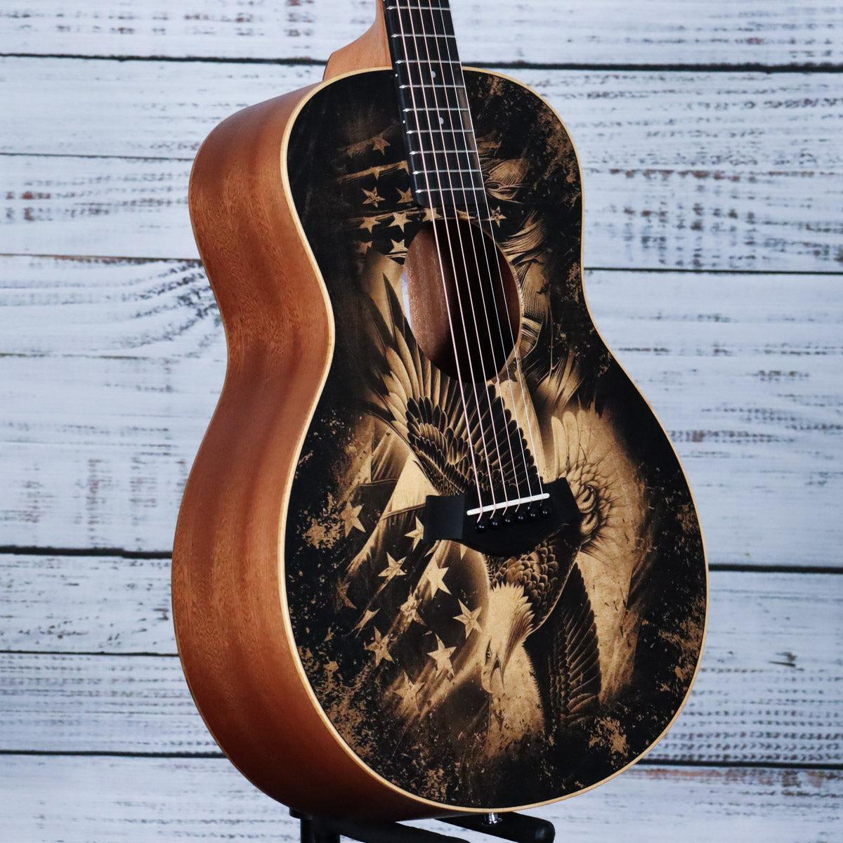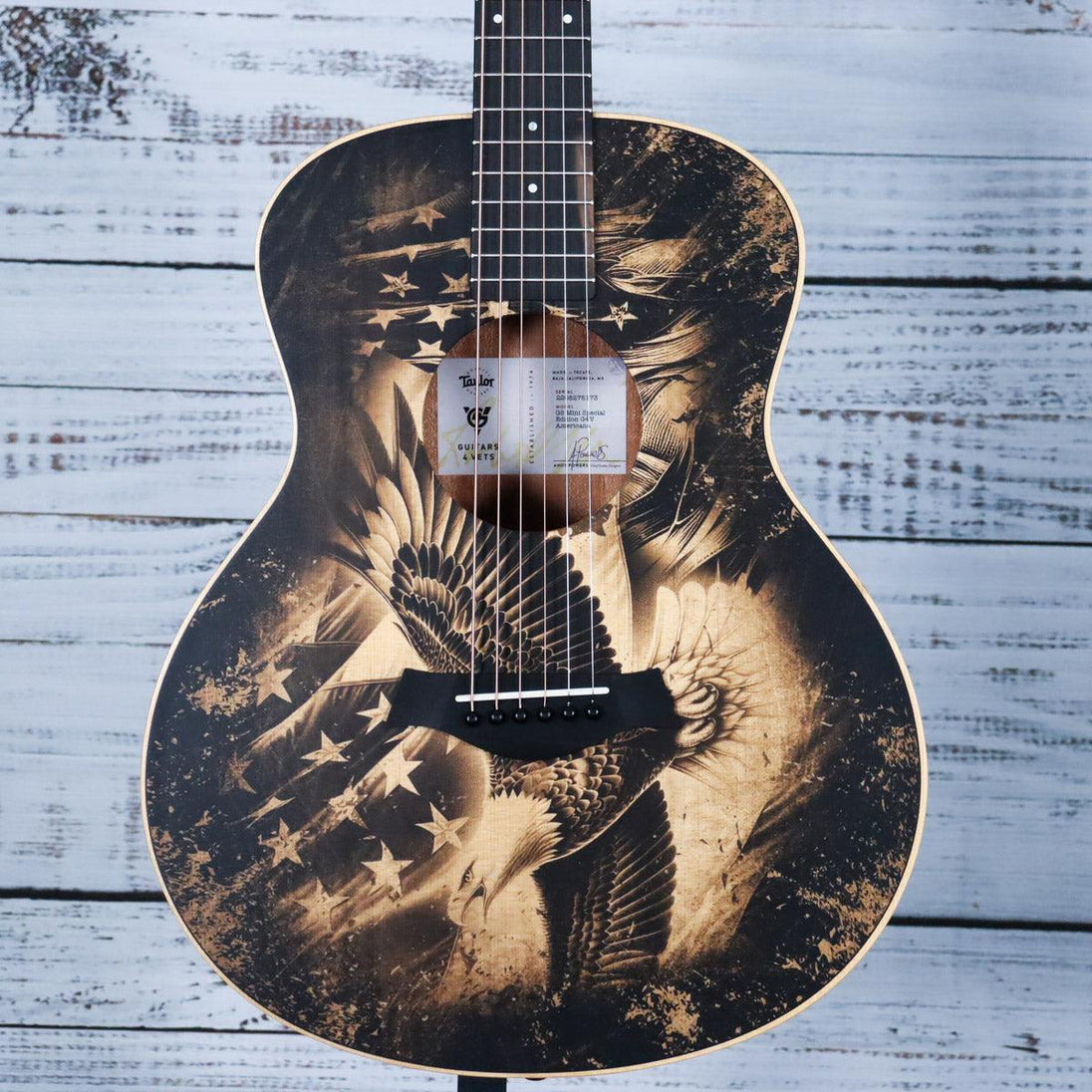 The Taylor Guitars 4 Vets GS Mini | Americana Special Edition supports veterans healing through music with an exclusive design honoring their service. Its compact size is ideal for travel, practice, or songwriting, while the easy-playing Taylor neck accommodates all skill levels. The solid torrefied Sitka spruce top delivers a bold, dynamic tone. This special-edition guitar features custom artwork, Italian acrylic dot inlays, chrome tuners, and a matte finish on the body and neck. A meaningful tribute paired with professional-quality craftsmanship for versatile, expressive play.