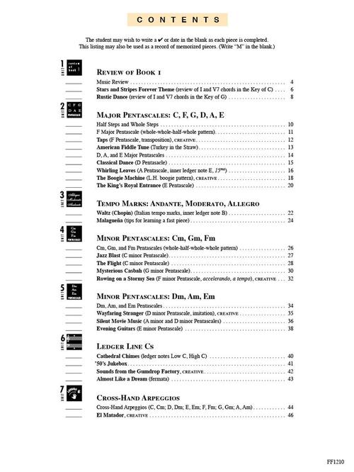 Major and minor pentascales; intervals through the 6th; C. G, and F major scales. Contents include: Almost Like a Dream • America • American Fiddle Tune • Beach Party • Beethoven's Fifth Symphony Theme • Blues Train • The Boogie Machine • Brahms' Lullaby • Can-Can • Cathedral Chimes • Chord Jumps • Classical Dance • Cross-Hand Arpeggios • El Matado.