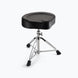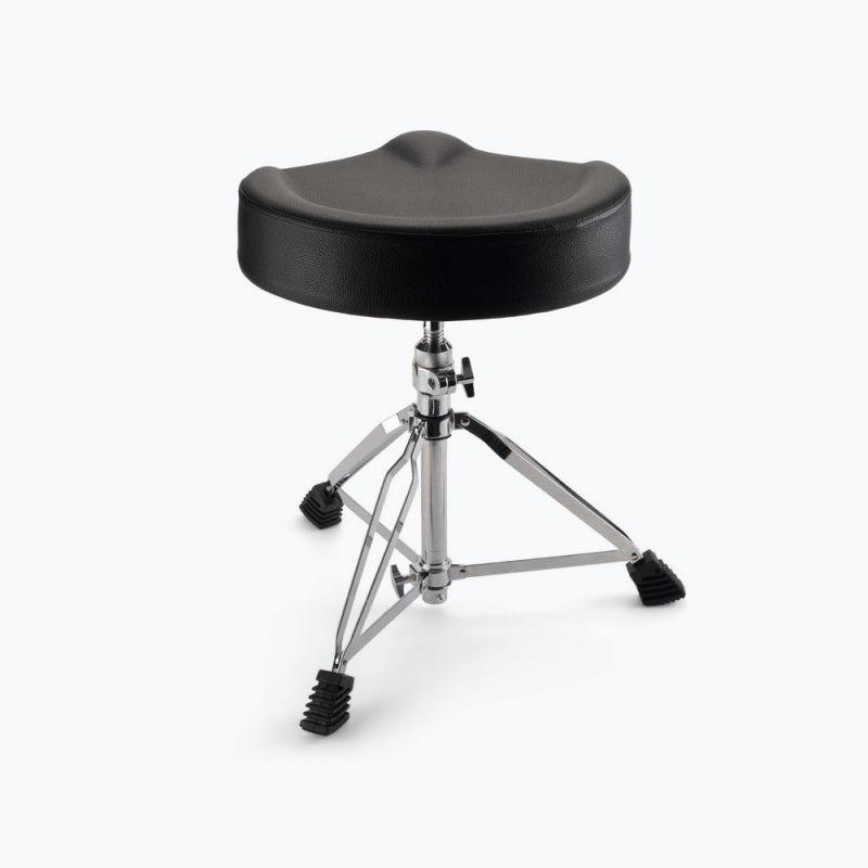 Stay comfortable without compromising the beat with the MDT4 Heavy-Duty Drum Throne. Its firm cushion provides pressure relief and evenly distributes body weight, reducing fatigue during long playing sessions. Saddle-style contouring grants extra legroom, facilitating foot pedal operation. A raised ridge around the edges promotes proper posture for live shows, recording, and practice. Height adjusts to maximize stick reach and pedal control, while a swivel-type mechanism allows for precise positioning, locking in place with a knob. A sturdy metal base with three braced legs and rubber feet provides robust weight support and prevents sliding. Chrome base and black leatherette seat add to the professional aesthetics. Easily foldable tripod base and detachable seat make setup/teardown and transport a breeze.
