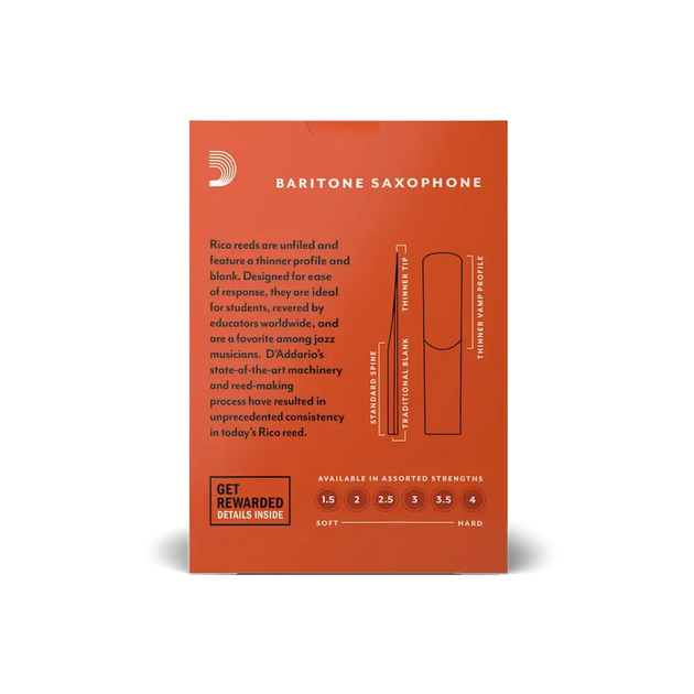 Rico by D'Addario Baritone Saxophone reeds are crafted with beginners and educators in mind, thanks to their traditional blank and profile for ease of response, plus unfiled cut for added support. These reeds are available for a full range of clarinets and saxophones to best suit your playing needs.