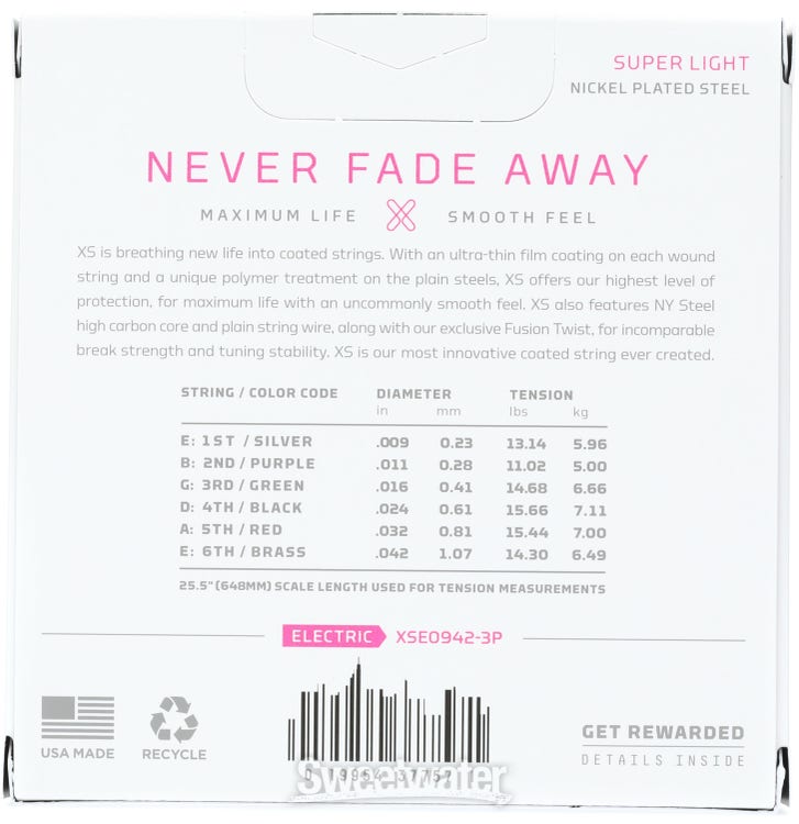XS is breathing new life into coated strings. With its ultra-thin film coating on every wound string and unique polymer treatment on the plain steels, XS offers our highest level of protection for maximum life with an uncommonly smooth feel. XS also features NY Steel high carbon core and plain string wire, along with our exclusive Fusion Twist, for incomparable break strength and tuning stability. XS is the most innovative coated string ever created.