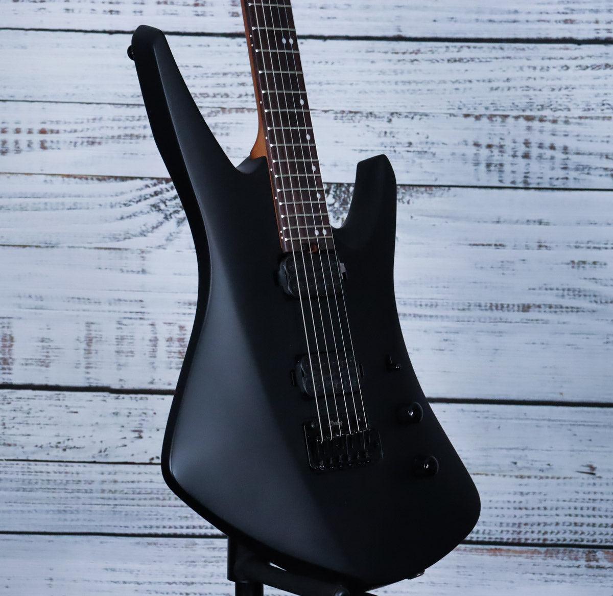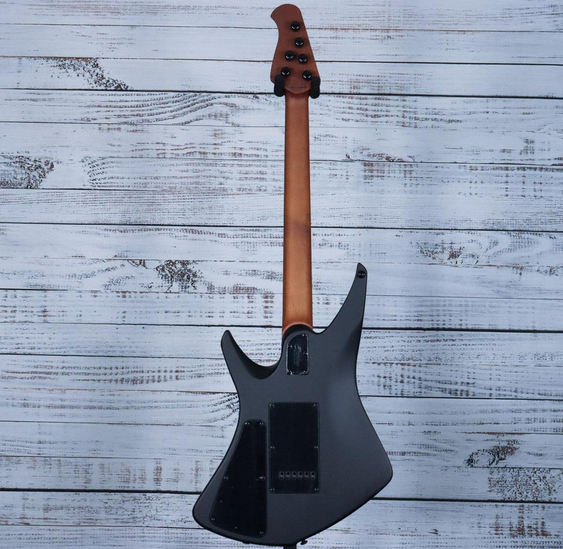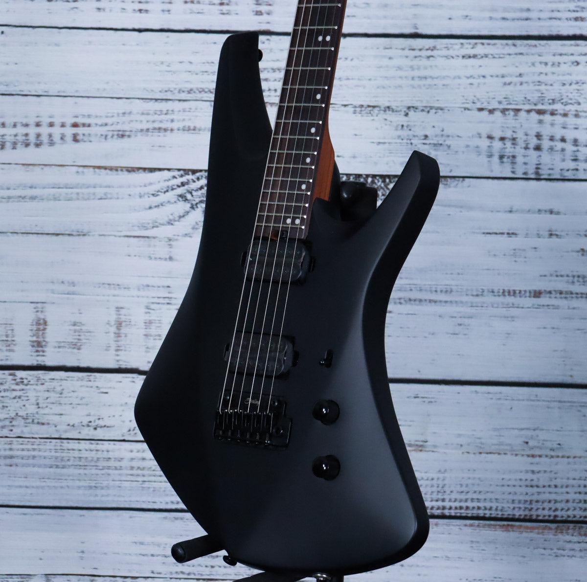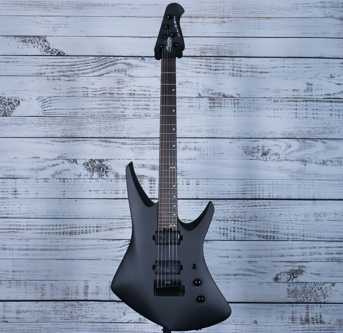 The Sterling Kaizen in Stealth Black is crafted with a standard scale fretboard and a uniquely shaped body that enhances both playability and aesthetic. Its slim profile roasted maple neck is tailored to Tosin’s distinctive style, offering exceptional comfort and control. The innovative headstock, fitted with Steinberger gearless tuners, ensures precise, stable tuning without the hassle of traditional tuning mechanisms. This guitar is engineered for expert players who demand advanced performance and reliability.