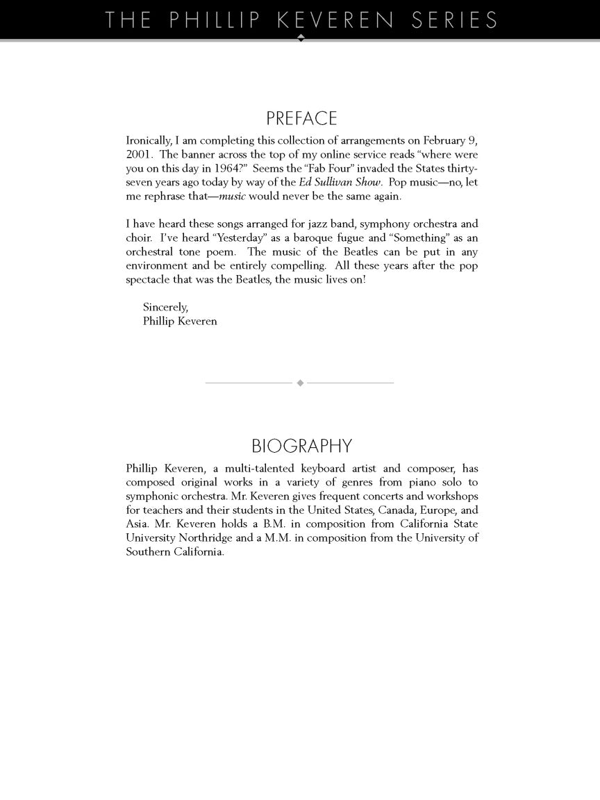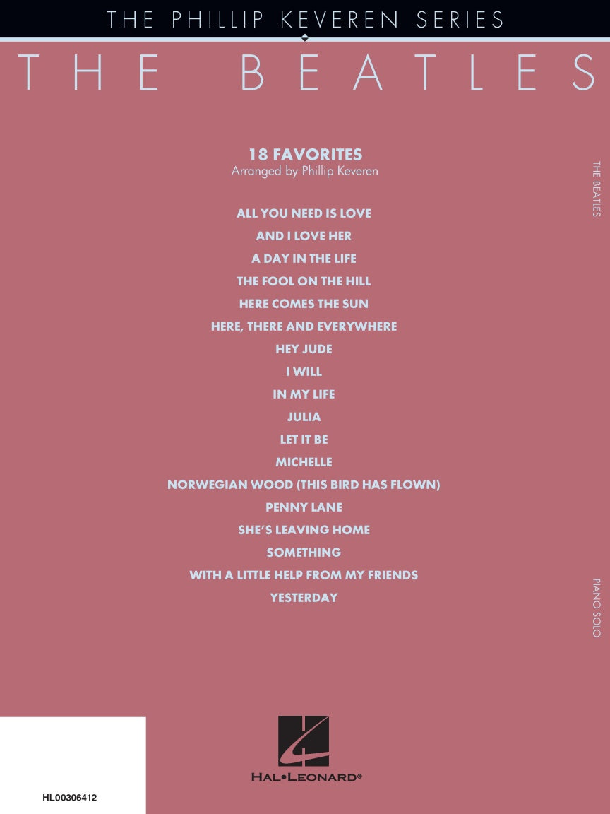 18 Fab Four favorites masterfully arranged for solo piano by Phillip Keveren: All You Need Is Love • And I Love Her • A Day in the Life • The Fool on the Hill • Here Comes the Sun • Here, There and Everywhere • Hey Jude • I Will • In My Life • Julia • Let It Be • Michelle • Norwegian Wood • Penny Lane • She's Leaving Home • Something • With a Little Help from My Friends • Yesterday
