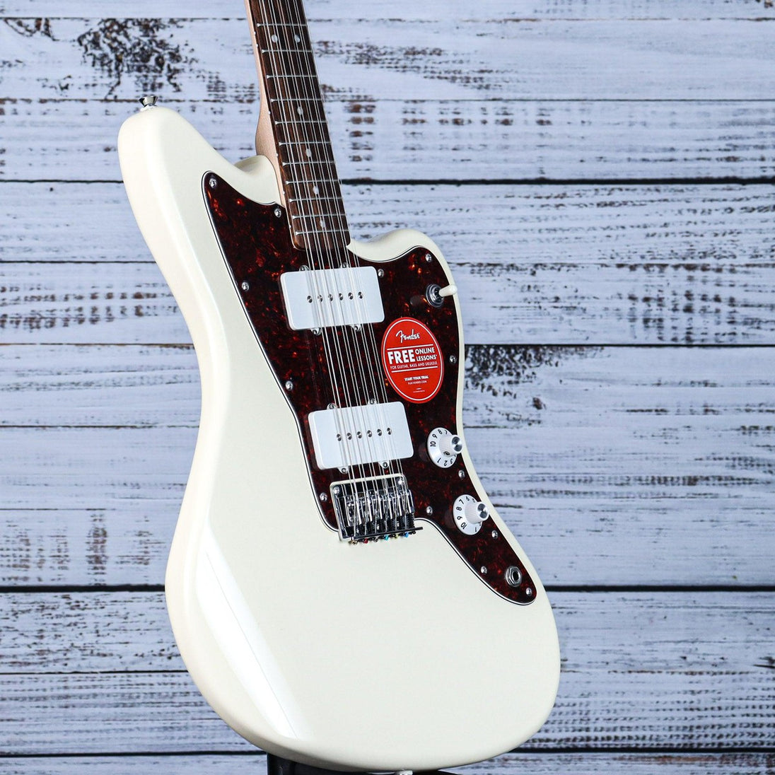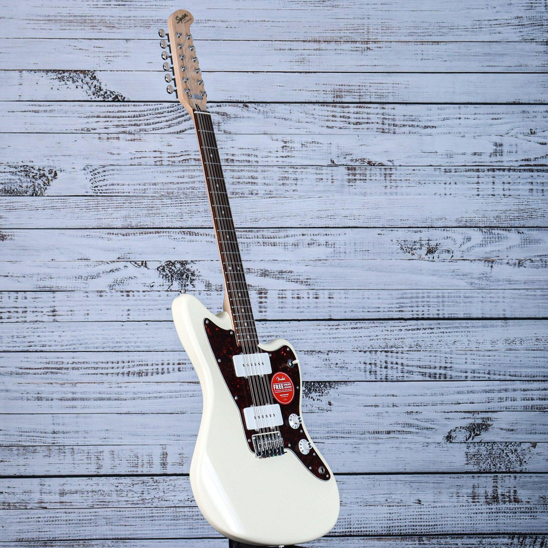 With its iconic offset body shape and rich harmonic character, the Squier® Jazzmaster® XII encourages the most adventurous players to chart a new course of guitar exploration. Featuring dual Fender-Designed alnico single-coil Jazzmaster pickups with 3-way switching and a vintage-inspired “hockey stick” headstock design, this 12-string model doubles down on chime-y tones and timeless style. Other player-friendly details include a graphite-reinforced “C”-shape neck for optimal stability and easy playability, a hybrid string-through-body/top-load bridge for reliable intonation, vintage-style tuning machines for smooth tuning action, and a gloss neck finish for a slick yet confident feel.