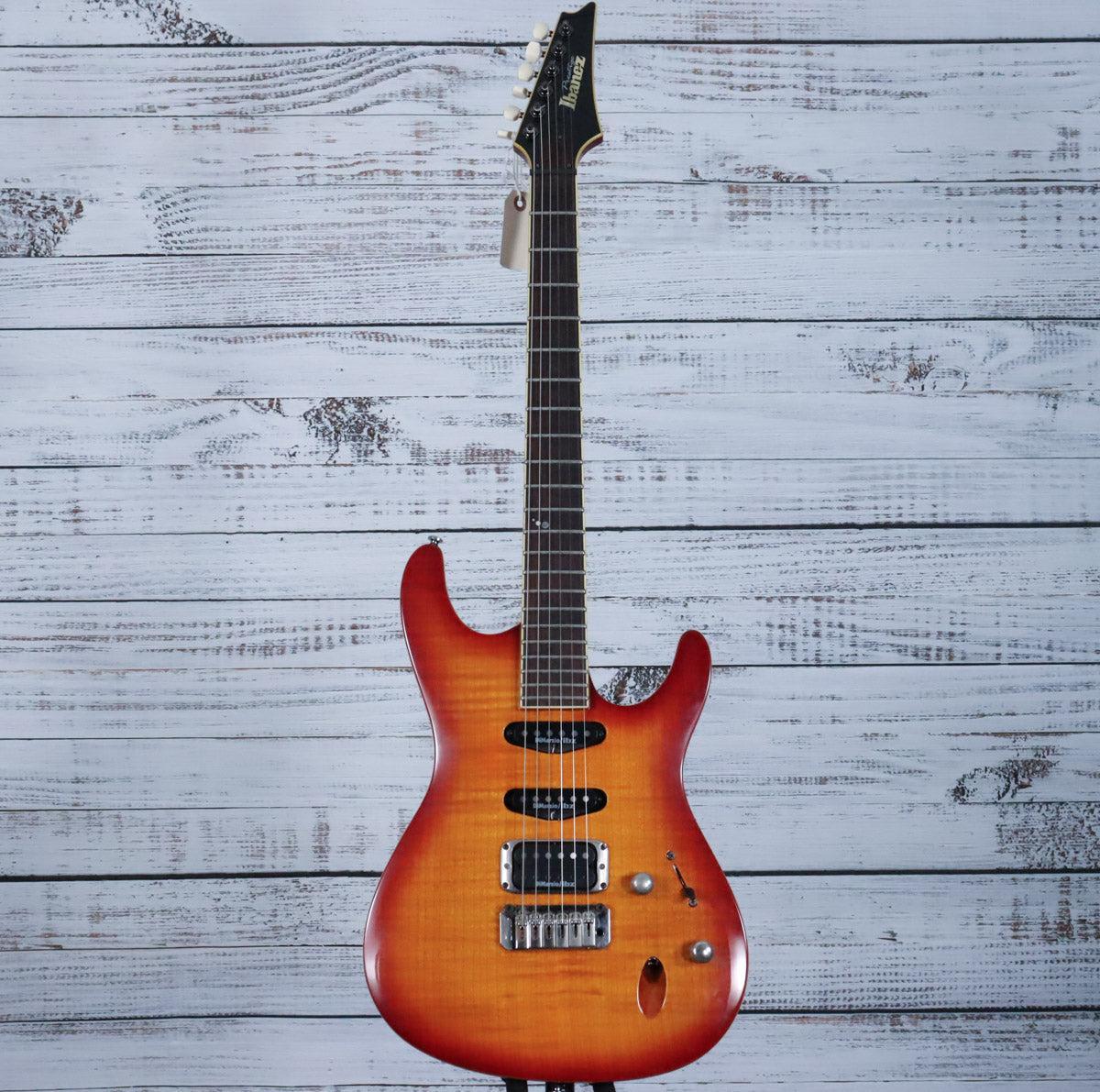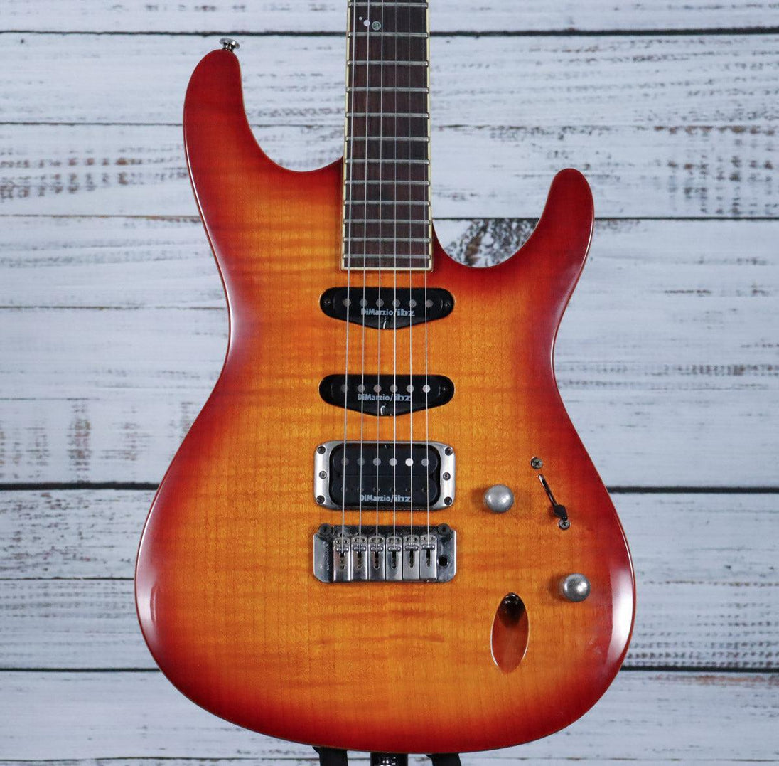 The *USED* Ibanez SA2160FM Prestige Electric Guitar in Honey Burst combines premium craftsmanship with versatile tonal options. Its flamed maple top over a mahogany body delivers rich resonance, while the set-in maple and bubinga neck with a 22-fret rosewood fingerboard ensures smooth playability enhanced by elegant binding and a unique twelfth-fret inlay. Equipped with DiMarzio IBZ pickups—including a triple-coil True Duo humbucker at the bridge and single-coils in the middle and neck—this guitar offers a broad sonic palette. Additional features like the SAT Pro tremolo bridge, plastic nut, and Gotoh tuners provide stability and precise tuning for professional performance.
