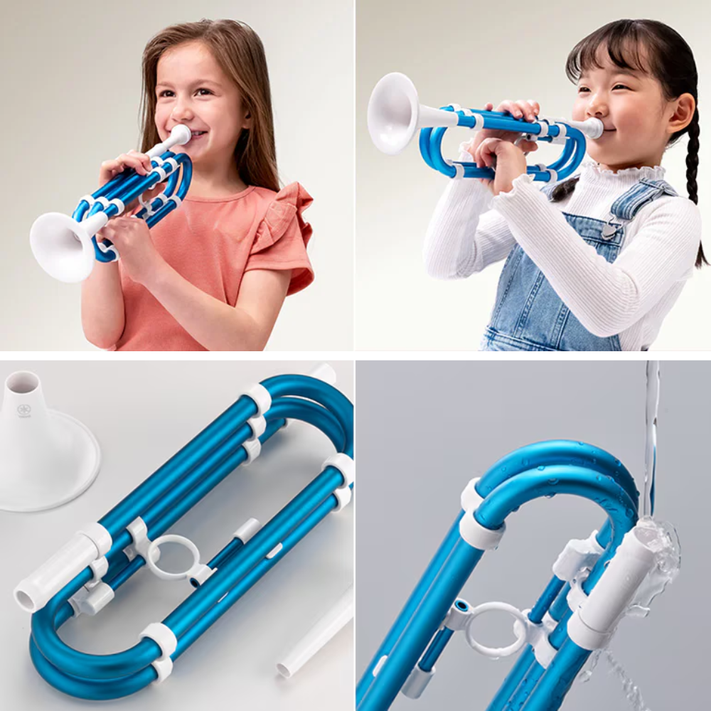 The Yamaha Trova Casual Wind Instrument is a unique horn featuring branched pipe technology that allows children to learn and enjoy the basics of brass instrument playing at an early age – a pre trumpet.